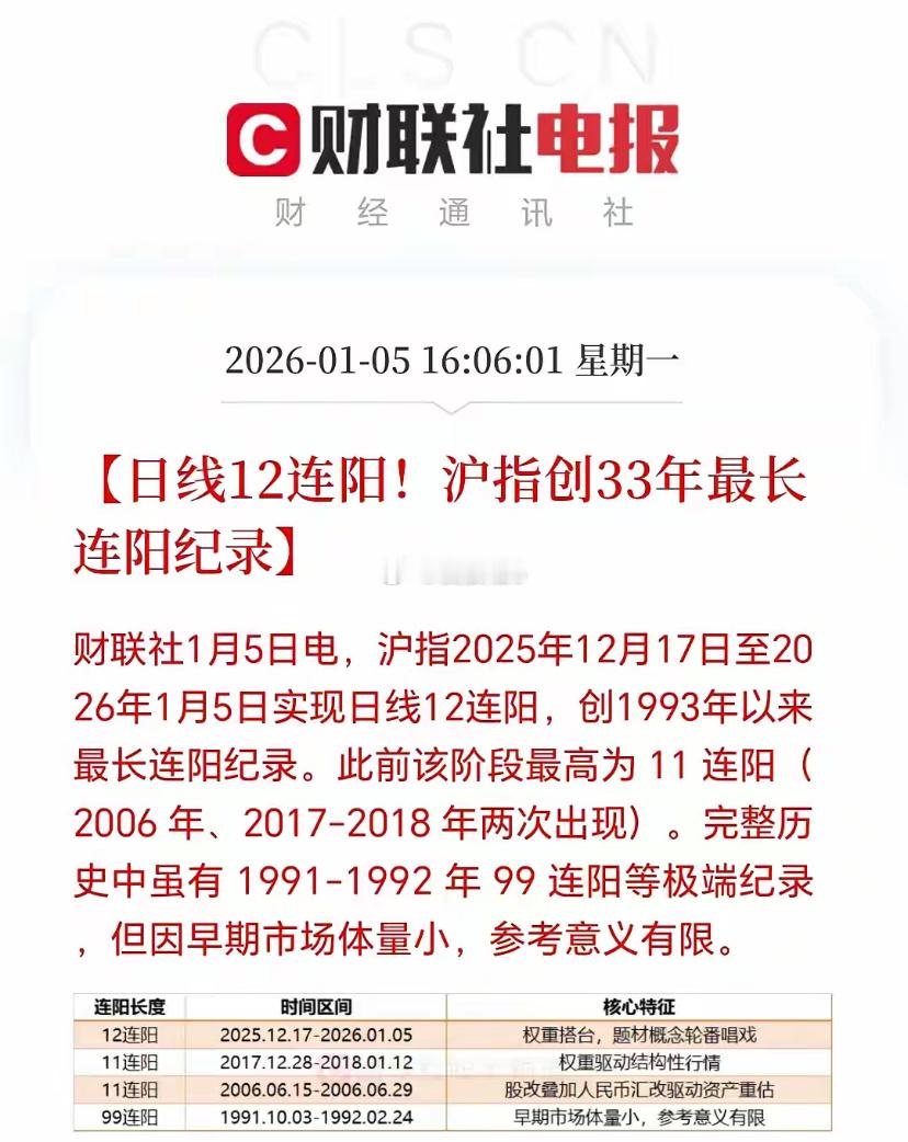 沪指这波操作太猛了!2025年12月17日到2026年1月5日,实现日线12连阳,创下1993年以来最长连阳纪录。之前最高也就11连阳,2006年、2017 - 2018年出现过两次。虽说历史上有1991 - 1992年99连阳,但那时候市场体量小,参考意义不大。从历史经验看,连阳意味着多头气势足。现在有人面对前高4034点压力,纠结要不要回避。其实在大趋势向上时,持股待涨或许才是上策,想回避高点,说不定后面得花更高成本追回来。当然,也不是说持有不动,趋势为王下,阶段优调或是主基调。这波沪指连阳,真是给市场添了把火!你认为会最终会止步几连阳?