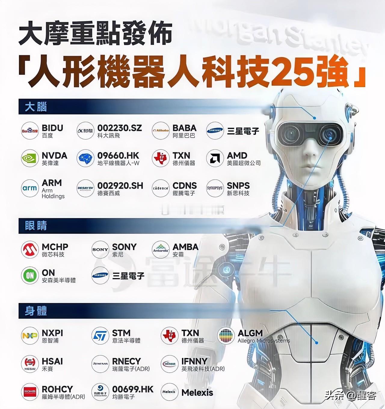 大摩发布人形机器人25强。核心观点为:人形机器人是下一个万亿美元级别的超级赛道,但目前的投资重点不应是“整机厂”,而应是提供核心零部件的“卖铲人”。精选了25家在人工智能、感知、运动控制等关键技术领域拥有核心壁垒的企业,中国有7家企业入围。 1、大脑 (AI & Compute):芯片、大模型、计算平台,英伟达 (NVIDIA)、AMD、百度、阿里巴巴、科大讯飞; 2、感官 (Sensors & Vision):视觉、激光雷达、触觉感知,索尼 (Sony)、禾赛科技 (Hesai)、地平线机器人、迈来芯 (Melexis)。 3、身体 (Actuation & Power) :电机驱动、电源管理、半导体 德州仪器 (TI)、三星、英飞凌、意法半导体,跨界/集成 (Auto-to-Bot) 汽车电子转型、系统集成 均胜电子、德赛西威。 预计到2050年,人形机器人及相关服务的市场规模将超过5万亿美元(也有数据提及硬件销售可达25万亿美元)。 报告专门分析了中国产业链: 1、“身体”强: 中国在电机、减速器、控制器等硬件制造环节拥有全球最完整的供应链和成本优势。 2、“大脑”待突破: 在高端AI芯片和基础大模型方面,与世界顶尖水平仍有差距。 3、整机制造: 中国目前在人形机器人领域占据主导地位,大部分新发布的人形机器人由中国公司制造,特斯拉Optimus的许多零部件也采购自中国。