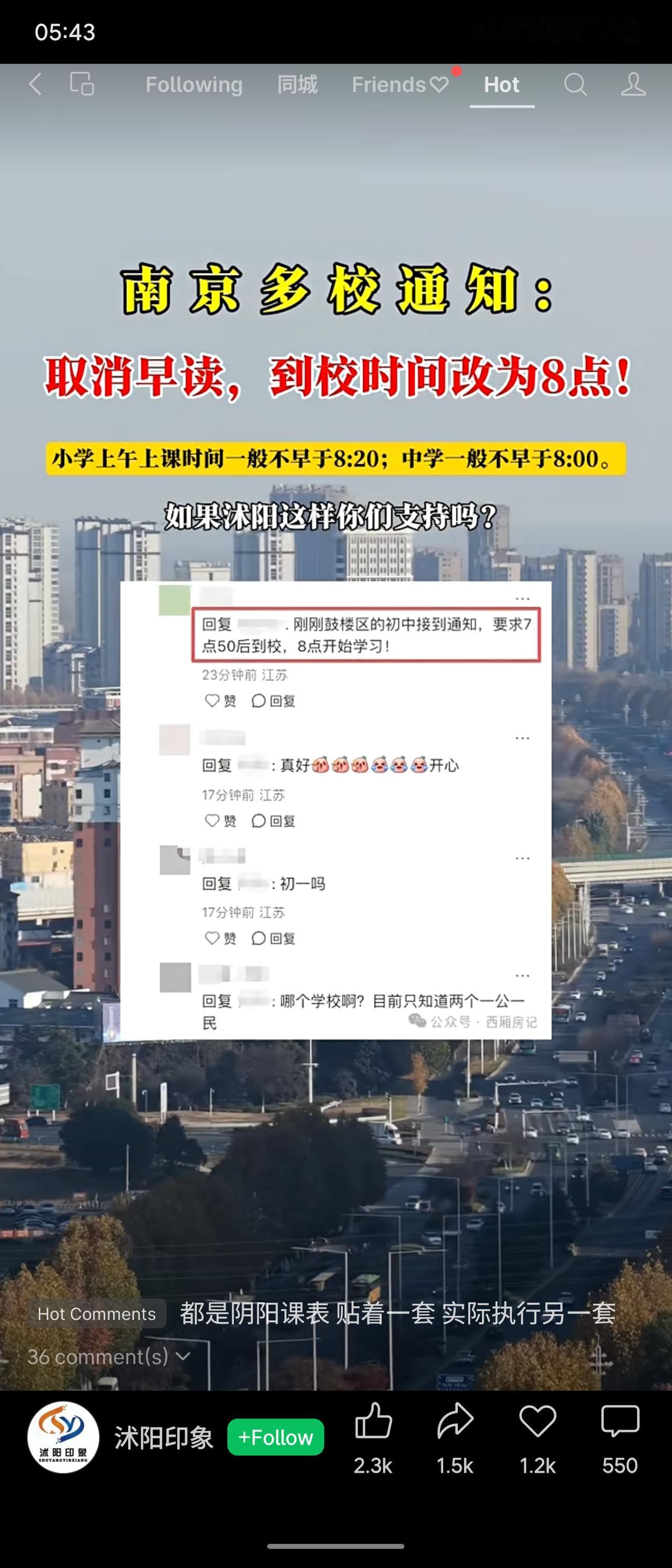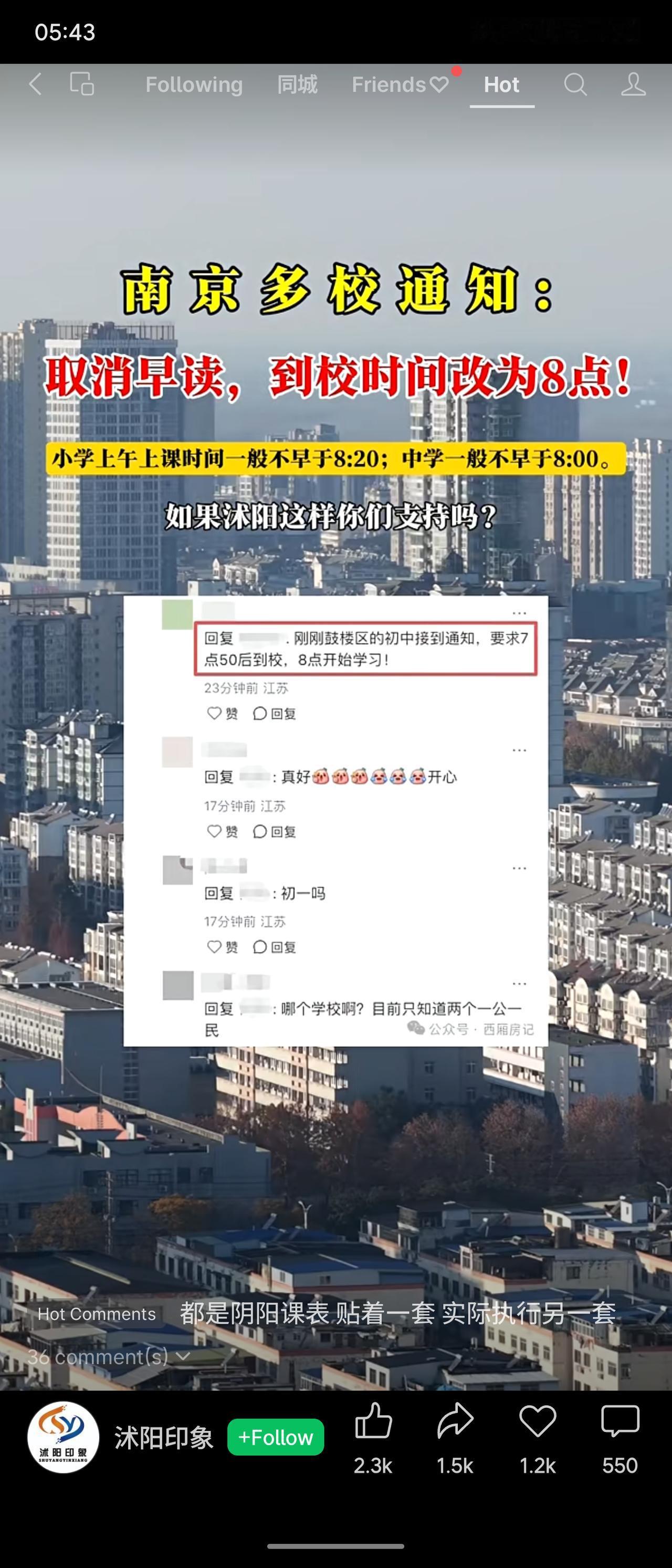 南京多所学校通知取消早读,将学生上午到校时间调整至8:00左右,小学不早于8:20。部分家长对此表示支持,认为能保障学生睡眠。同时,也有声音质疑实际执行可能存在“阴阳课表”,即规定与操作不一致的现象。