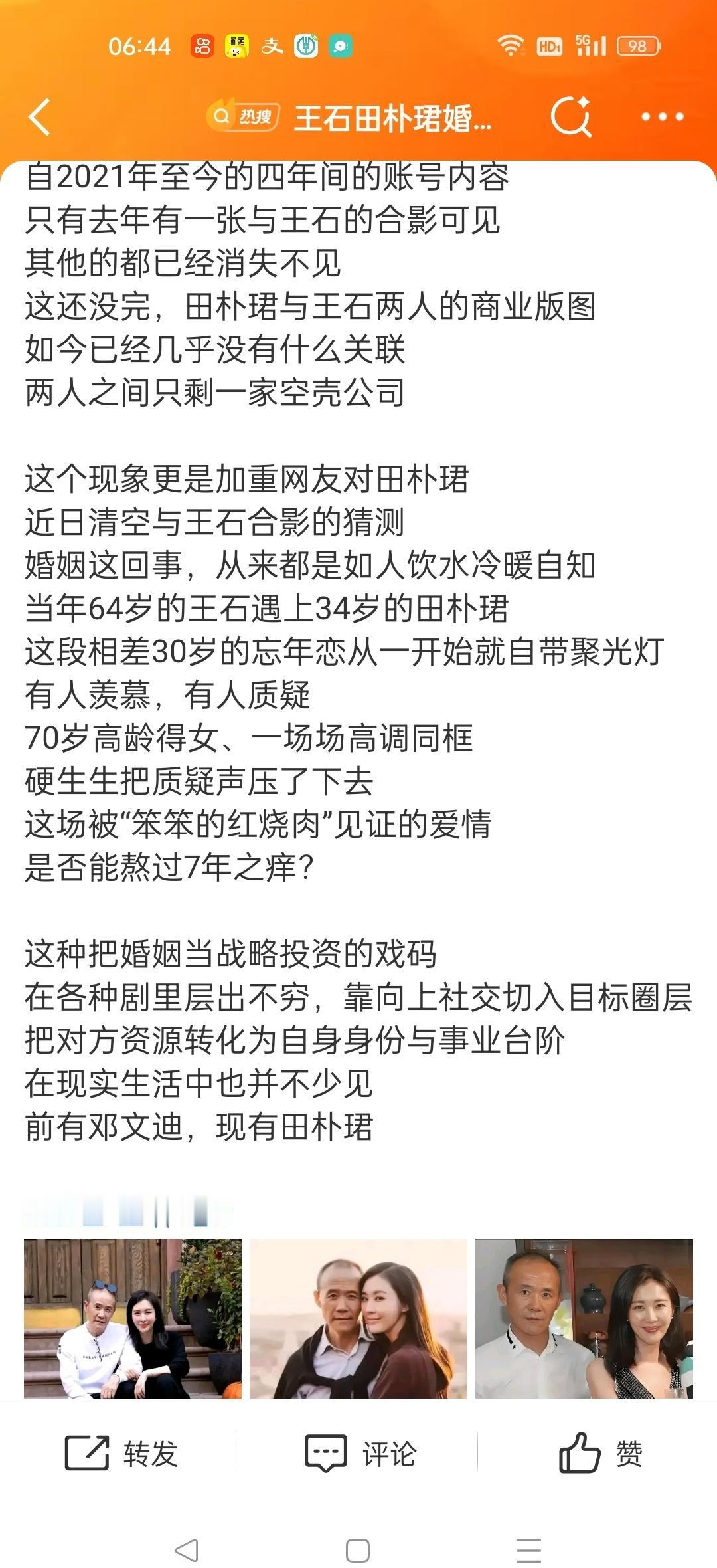 王石60岁的人千万别找个小媳妇男人人到中老年,就越来越温顺了,因为他得指望老婆了。女人过了40越来越无惧无畏了,因为人质长大了。 这就是老男人找小女人的代价。开始老男人用经验降维打击,收获小女人对你的崇拜,觉得吃了还魂丹 .到你老了, 男女强弱转换, 生命的馈赠价格早都写好了。