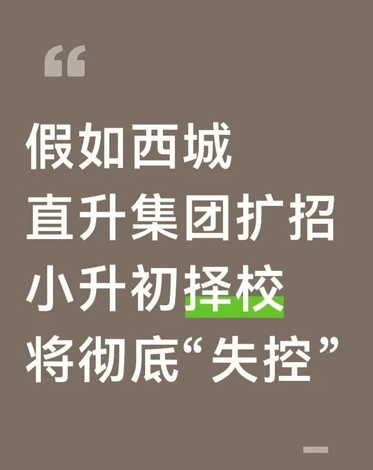 假如西城直升集团扩招小升初择校将“失控” 校到额25年增加了,具体的集团直升名额还没出来,但是大家纷纷猜测也会扩招。接下来再小升初择校的时候,真的需要谨慎谨慎再谨慎,不然娃再统招阶段会失去优势。 西城鸡娃 西城小升初