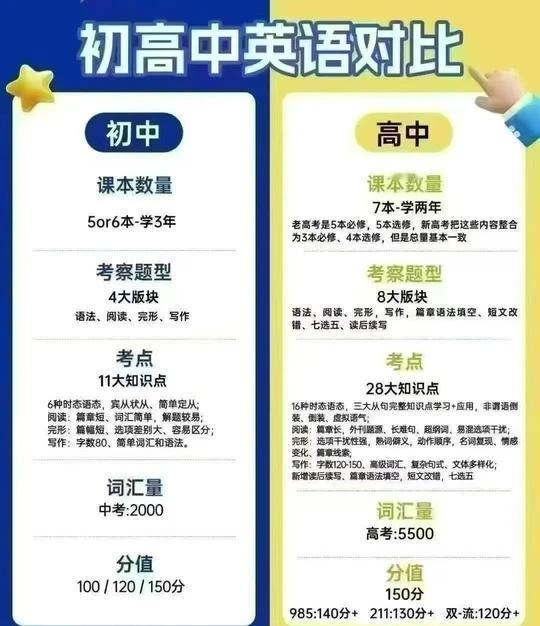 小升初、初升高必看!英语学习的三层进阶之路 ✅ 词汇量跨度 初中1600-2000词,主打日常高频 高中直冲3500核心+1000拓展,学术词汇密集上线 ✅ 知识点覆盖广度 初中啃透八大时态、简单句,搞定基础交际 高中深挖非谓语、虚拟语气、倒装句,语篇逻辑全解锁 ✅ 题型丰富程度 初中题型基础直白,单选、基础阅读轻松应对 高中新增七选五、语法填空,阅读重推理,写作要深度 英语提分找对节奏,升学超车不迷路!