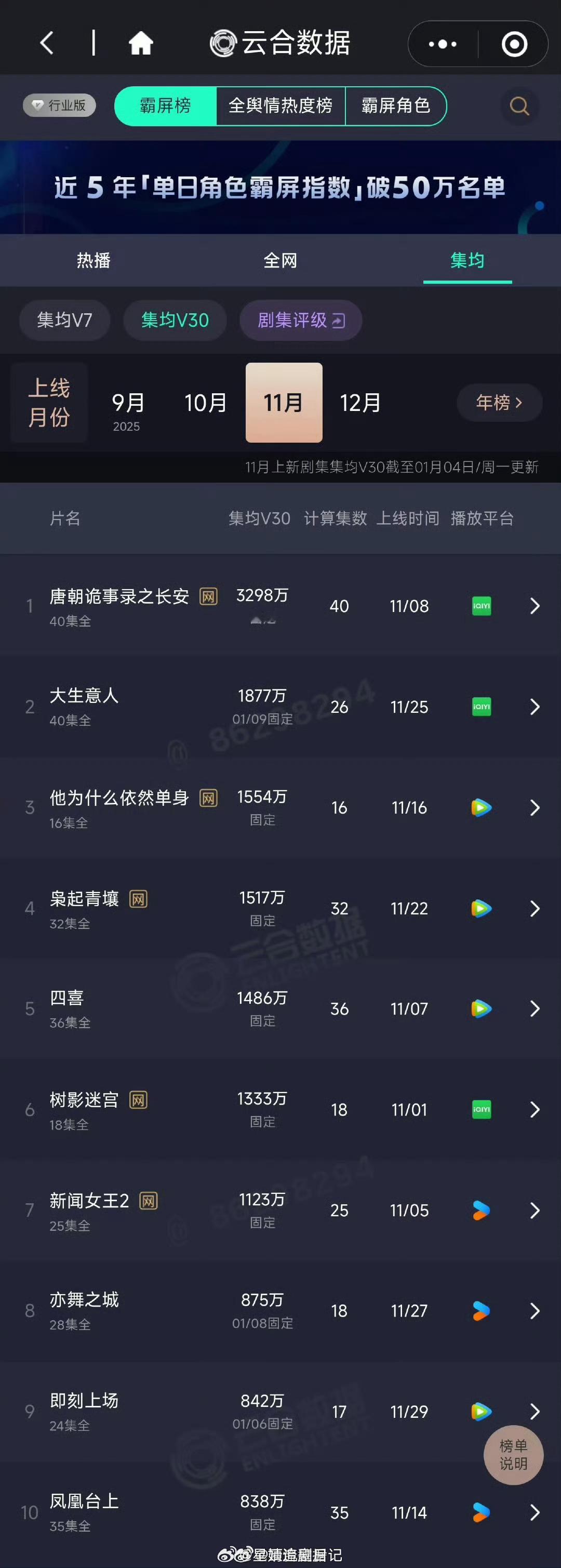 云合2025年10月、11月集均V30榜单更新 10月第一 侯明昊 入青云11月第一 杨旭文 唐诡3