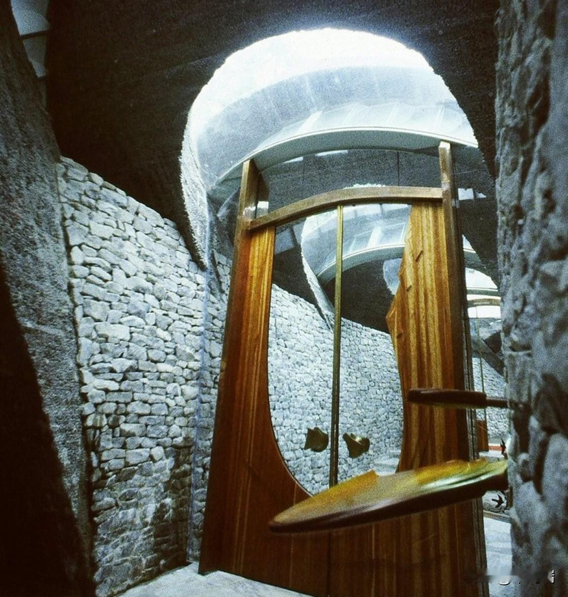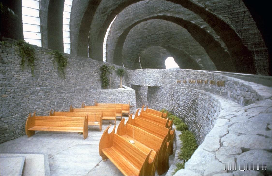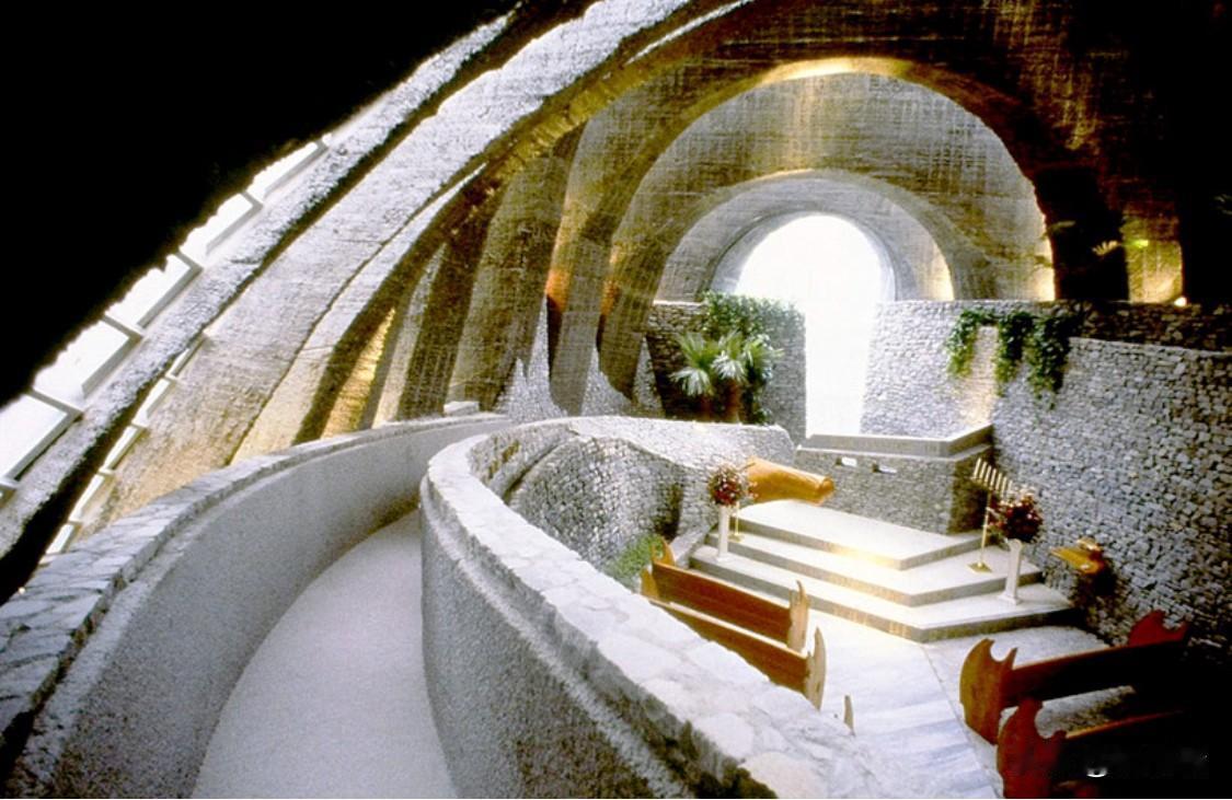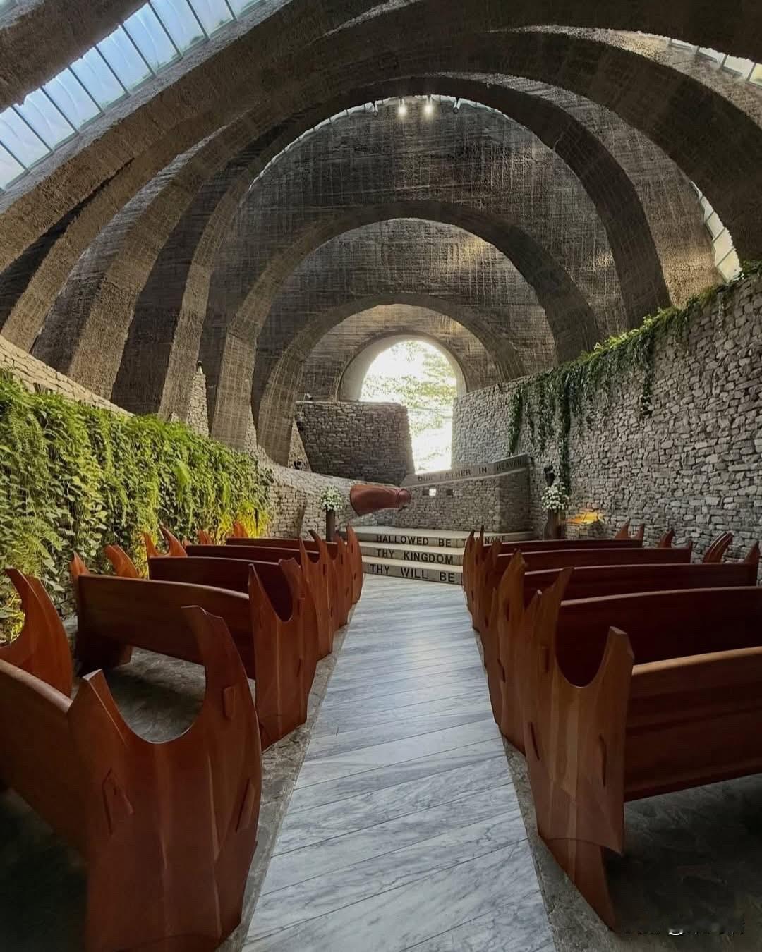 这个独特的建筑是位于日本长野县轻井泽町的石之教堂(Uchimura Kanzo Memorial Stone Church,内村鉴三纪念堂)。它由美国建筑师肯德里克·凯洛格(Kendrick Bangs Kellogg)设计,于1988年竣工。 教堂采用“有机建筑”原则设计,旨在将人造结构与周围的自然环境(石头、光线、水、绿色植物、木材)无缝融合。 该教堂是为了纪念日本基督教思想家内村鉴三而建,他倡导“无教会主义”,认为信仰不应受限于特定建筑形式,大自然中的任何地方都可以是祈祷的场所。因此,教堂内部没有传统的十字架。 建筑由交替的石拱和玻璃拱组成,石拱代表男性(力量和稳定性),玻璃拱代表女性(柔和和精致),象征着新郎和新娘、男性与女性的和谐统一。 自然光通过玻璃天窗和拱门间的缝隙射入教堂,随着太阳轨道的移动,在内部形成不断变化的光影效果,营造出宁静、神圣的氛围。 教堂主要用作婚礼场地,因此参观时可能需要避开婚礼仪式时间。