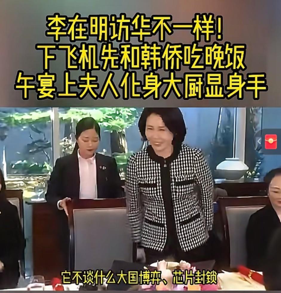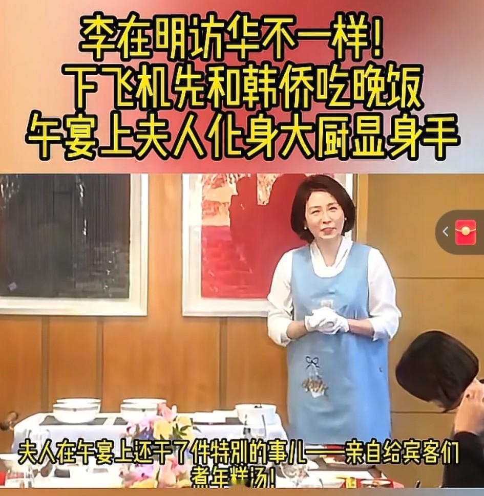 李在明金惠景两口子挺聪明。 来北京后,没有着急去钓鱼台和我们的领导人见面会谈,而是去参加旅华韩侨会的晚宴,去见一见自己的老乡同胞。 李在明心里清楚,现在国内那帮保守派盯着他的一举一动,他得先给自己立个稳当的人设,这不是简单的家常饭,这是吃给家里人看的,告诉韩国老百姓,我是去给咱们在外面打拼的子弟撑腰、办实事的,这是吃给舆论看的,把这趟"破冰"的基调定在民意和生计上。 在这场满是故乡情愫的晚宴上,除了李在明在台上掏心窝子,他的老婆特意换下抵京时那件硬朗的宝蓝色大衣,取而代之的是一套剪裁极简却韵味悠长的粉色韩服,让人看了很亲切。 在第二天的招待午宴上,她换上了一身素雅的淡蓝色韩式背心裙,亲自给宾客们煮年糕汤,尤其是她那笑容,比任何外交辞令都有杀伤力,这是在用"烟火气"给紧绷了六年的中韩关系化冻。 一个成功的男人必须得有个贤内助,夫妻两个是绝配。 政权要独立,经济要发展,技术要传承,市场要找准,放下姿态,睦邻友好,打开局面,落定基石。