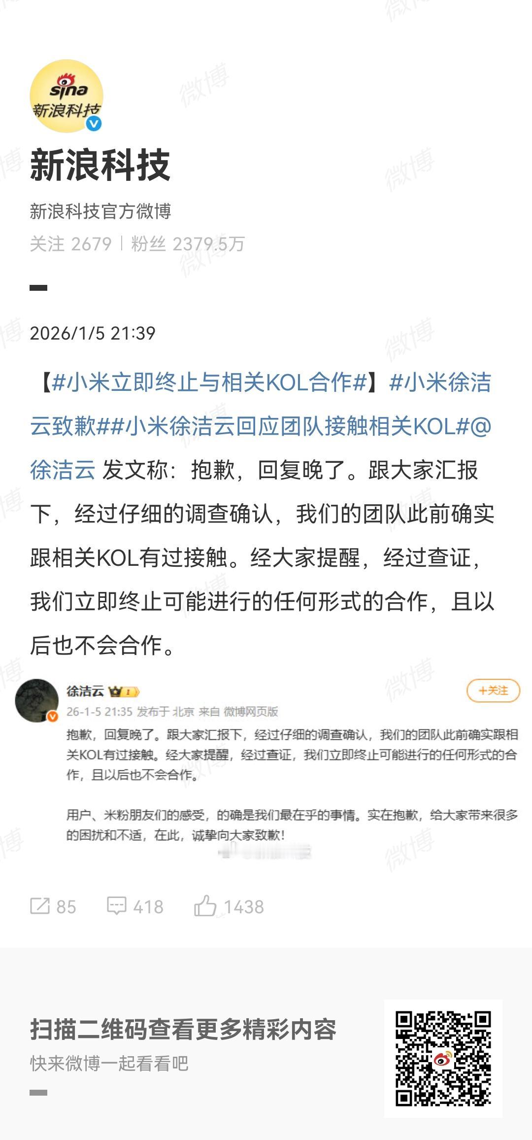 小米竟然被自己的粉丝给抵制了,直接导致现在负责小米公关业务的徐洁云,都不得不深夜发文致歉,而这一次事件起因是小米决定跟一名叫做“万能的大熊”的科技博主合作,这个“万能的大熊”是一个著名的科技博主,但是其之前的立场一直都是反小米的,曾多次针对小米。小米粉丝看到小米竟然跟一个“反小米”的科技博主合作,直接气炸了,感觉自己遭到了背叛。 另一名长期跟小米有合作关系的科技博主“午后狂睡”,更是发微博,直接@雷军,宣布将解除与小米的合作。 小米也没有想到,自己这个行为,竟然激发出了小米粉丝这样巨大的抵制,顿时都慌了。深夜时分,现在负责小米公关业务的徐洁云,直接发微博说:“经大家提醒,经过查证,我们立即终止(与万能的大熊)可能进行的任何形式的合作,且以后也不会合作。”微博最后更是给小米用户和粉丝道了歉,“诚挚向大家致歉”。 看到这一起风波,我是非常吃惊的,万万没有想到,仅仅因为跟一个科技博主的合作,就激发出了小米粉丝这样巨大的抵制,从中可以窥见,小米的粉丝,对小米还是挺忠实,有很多铁粉,眼里容不得一点沙子,是非常具有主动性的维护与小米有关的一切。小米事后的处理,也值得点赞,虽然犯了错,但也及时纠正了自己的错误。 只不过,从另一个角度来看,小米集团选择与哪一个科技博主合作,相信也是经过非常详细的调查,认为这个科技博主有助于小米的发展,“万能的大熊”虽然之前多次批评过小米,但如果与其进行合作,相信也能减少一个小米的反对者,长远来看,这对小米也算是好事,小米粉丝这样的抵制,某种程度上说,似乎也有一点过于情绪化了。