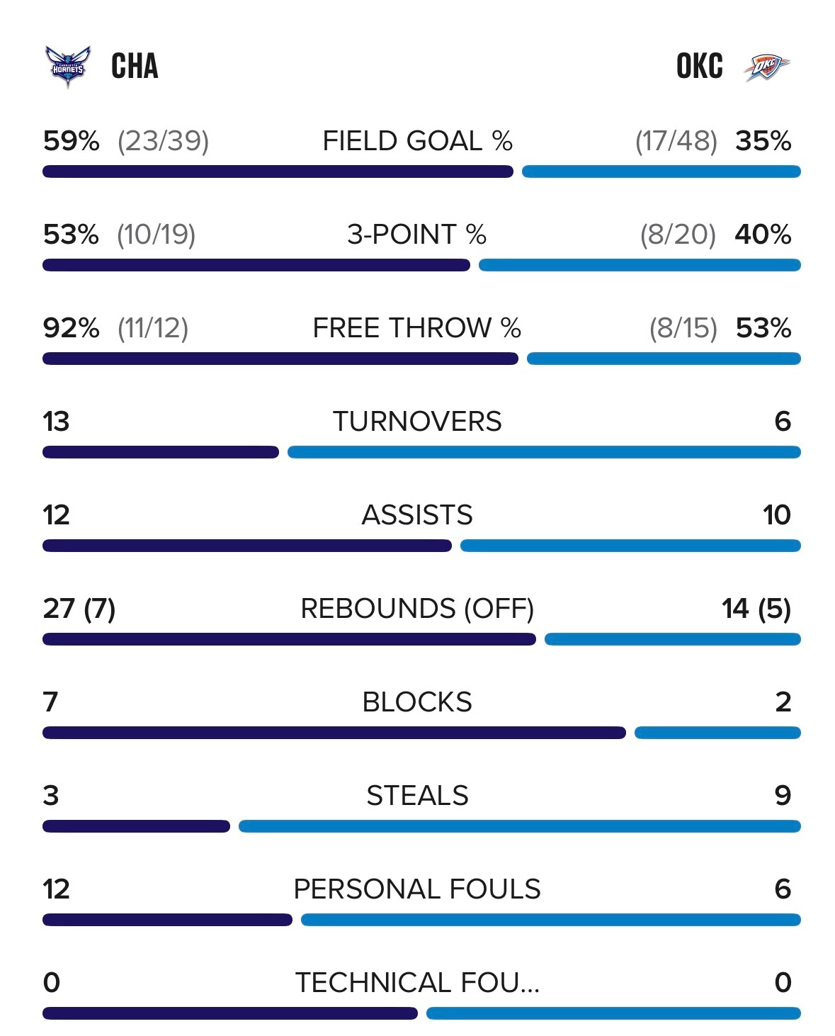 黄蜂半场13个失误,三球作为主控没有助攻4失误,一看比分半场17分领先雷霆,第二节让卫冕冠军就17分今天雷霆可能进攻状态是本赛季最差一次了,2分比3分铁