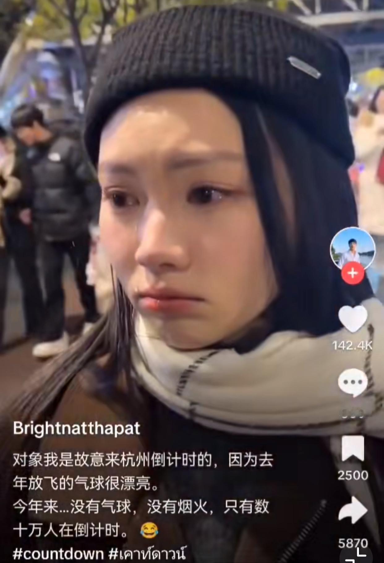 近日,看到一个视频,一个泰国女孩去年在网上看到很多中国各个城市热闹的跨年活动,于是今年就慕名来杭州跨2026,结果发现没有气球,没有烟花,只有倒计时….她很伤心当场就哭了…. 她这是去错城市了,去年因“加特林烟花”事件,杭州次年就直接取消了!自己没做好攻略,怪谁呢!要不明年再去宁波试试[吐舌]