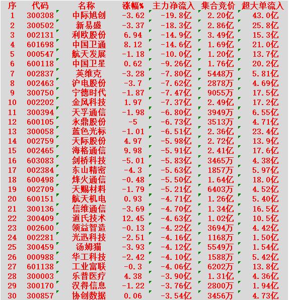 1月6日上午盘,主力趁低位,大幅买入的30名单: 山子高科:涨幅10.12%,净流入12.9亿元; 东方财富:涨幅4.55%,净流入12.5亿元; 中超控股:涨幅9.99%,净流入7.73亿元; N陕旅:涨幅76.29%,净流入6.24亿元; 同花顺:涨幅8.75%,净流入5.88亿元。 1月6日中午收盘,主力资金“大幅卖出”的30名单: 中际旭创:下跌3.62%,净流出19.8亿元; 新易盛:下跌3.37%,净流出18.3亿元; 利欧股份:上涨6.94%,净流出14.9亿元; 中国卫通:上涨8.12%,净流出14.6亿元; 航天发展:下跌1.18%,净流出10.0亿元。