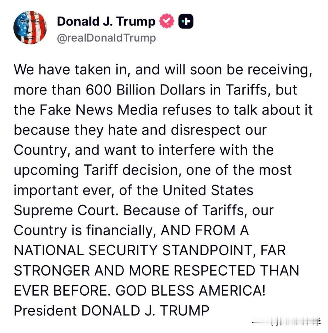 面对最高法院即将到来的关税判决,川普在社交媒体上发文称赞关税政策。 “我们已经征收了600多亿美元的关税,而且很快就会收到更多,但假新闻拒绝报道,因为他们憎恨并蔑视我们的国家,还妄图干扰美国最高法院即将做出的关税裁决——这是有史以来最重要的裁决之一。正因为关税,我们的国家无论是在财政上,还是从国家安全角度看,都比以往任何时候更强大、更受尊敬。上帝保佑美国! ”
