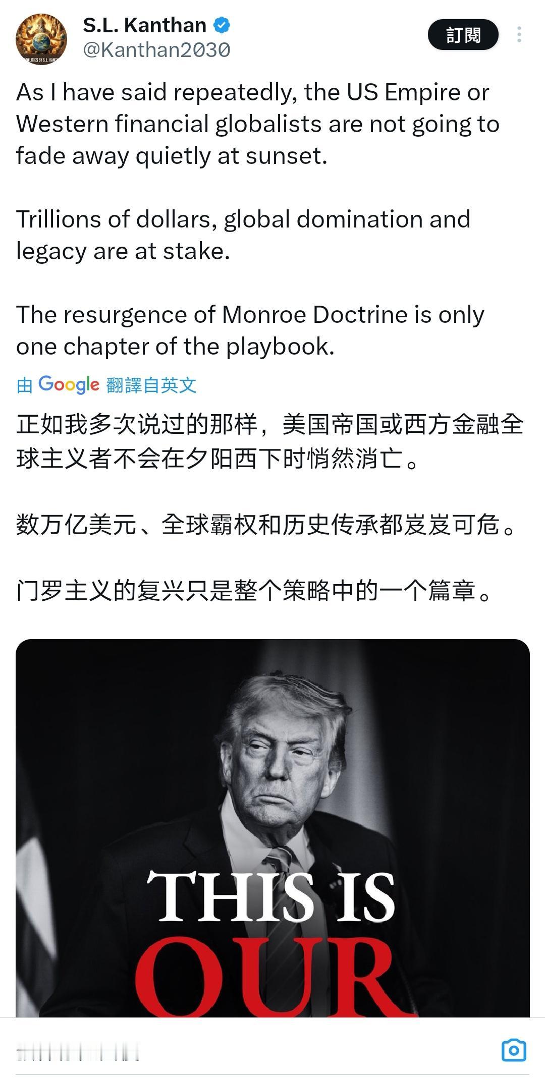 印度政治评论家如是说: “正如我多次说过的那样,美国帝国或西方金融全球主义者不会在夕阳西下时悄然消亡。数百亿美元、全球霸权和历史传承都岌岌可危。门罗主义的复兴只是整个策略的一个章节。” 达里欧在他《原则:应对变化中的世界秩序》一书中有过这样的论判:“帝国在其统治末期往往会变成更加不稳定。” 我将达里欧这一“论断”,应归因于马克思的理论:帝国在其统治末期时,为了维持超额利润和霸权地位,会采取更激进的对外扩张、金融投机、军事干预等手段,导致国内阶级矛盾和国际地缘冲突同时激化,最终使整个体系陷入"更加不稳定"的状态。这种不稳定性是制度性、结构性的。 以我们的年纪,应该都有机会见证帝国在日暮之时轰轰烈烈坍塌的过程。 Source: X