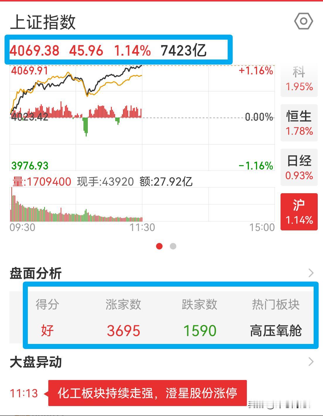 13阳连涨!A股上午沪指上涨45.96点,涨3695家,跌1590家。这两天A股涨了100个点,我的两只股,居然是几分几分涨,啥时候能回本呐?! 不管怎么样,我还是希望各位投资者:大盘红,个股红,账户天天红彤彤,投资顺利,财源滚滚!