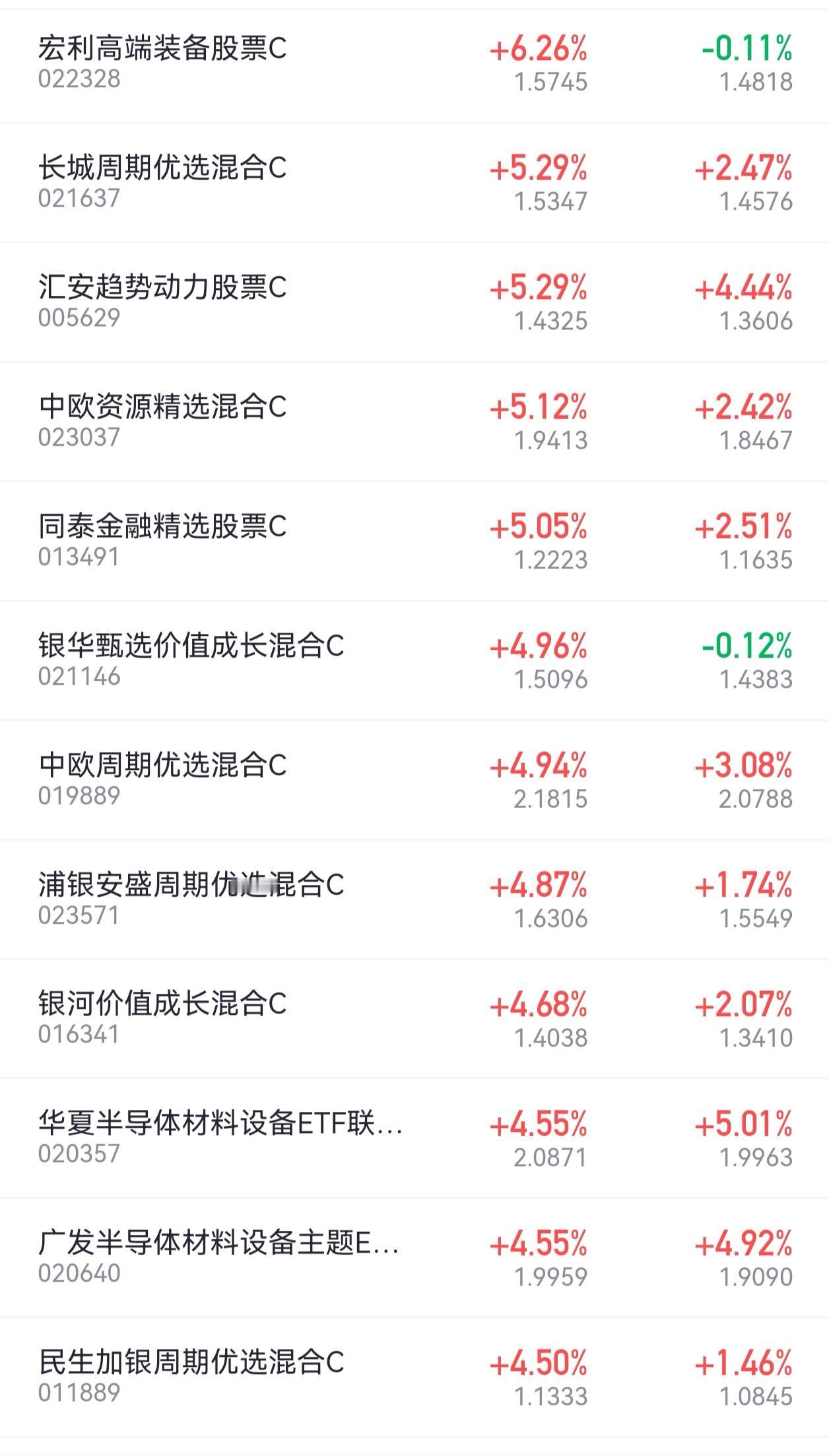 午盘收盘:半导体、有色金属霸榜基金涨幅,热门板块走势分化 基金涨幅榜今日被有色金属和半导体相关基金强势占领,前列席位几乎被这两大板块标的包揽,从盘面数据来看,有色金属连涨4天涨幅超3.7%,半导体也跟随科技主线走出震荡上行态势,资金对资源类和科技类基金的布局意愿凸显。 各热门板块速评 - 半导体:震荡走稳,细分标的小幅异动,暂未形成领涨势头。 - 有色金属:领涨全场,连涨4天,稀土永磁等细分方向资金抢筹明显。 - 证券:早盘上攻带指数,现涨超2%,成大盘翻红关键推手。 - 商业航天:午盘获资金加码,高低位标的齐活跃,热度依旧。 - CPO:受夜盘拖累调整,走势偏弱,暂无企稳信号。 - 机器人:盘中两度发力未果,筹码端承压,看明后天补量情况。 总结下来,午盘就是有色金属和半导体的主场,其余热门板块各有表现,商业航天虽强但CPO、机器人暂遇阻力,下午重点看证券能否持续带指数,以及机器人能否补量反攻!想买点基金有没有什么行业推荐 今年买基金都赚钱了吗,收益怎样基金 股票基金 股票基金收益 买基金 股票指数基金 基金指数 基金行情 指数型基金 基金涨跌榜 基金收益安排 指数etf基金 基金重仓20强 混合基金 炒股基金 周基金收益
