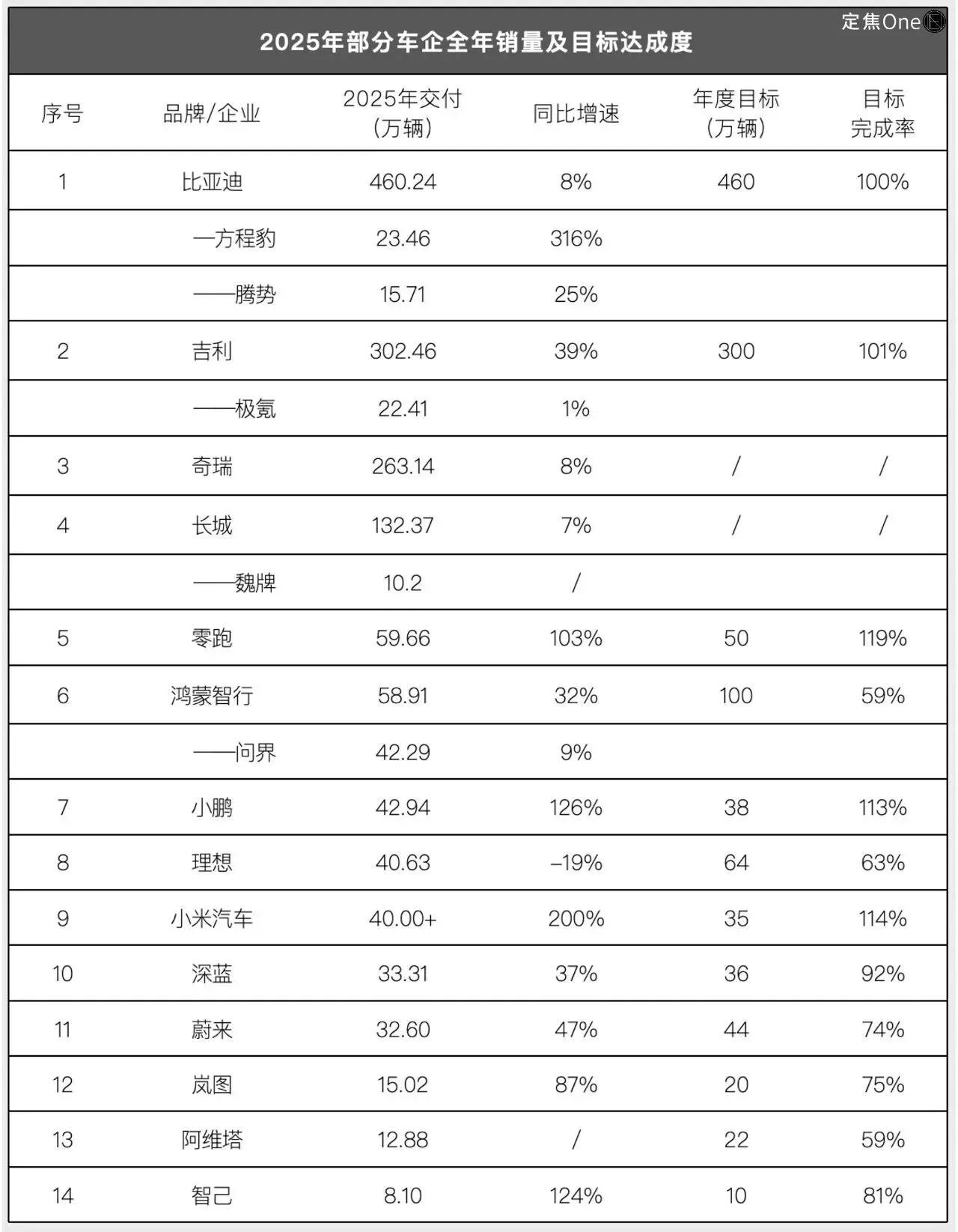 2025年国产车企目标完成率,最令人意外的不是比亚迪,也不是小米,而是华为鸿蒙智行。比亚迪作为国内断层级的老大哥,全年卖了460万辆车,压线完成了年初的目标。卖了302万辆车的吉利,也完成了300万的年度目标。这两大传统车企转型新能源赛道,可谓相当成功,比亚迪是all in 新能源,除了混动发动机外,彻底抛弃了纯燃油车。吉利依然保留了不少油车基本盘,主要还是海外需求强劲,约一半都卖给了老外。 新势力车企中,零跑一黑到底,小米全年高开高走,小鹏强势逆袭,重新赶超理想和蔚来。看似三家车企没什么共性,实则殊途同归。零跑将性价比进行到底,精准卡住了10-20万的价格带,背后是对成本的控制达到国产一流。小鹏果断将高阶智驾下放后,直接打通任督二脉,面对同档次的对手,优势一下子就出来了,销量一路走高,成功完成对理想的反超。小米更不用说了,虽然价格集中在21-30万的豪车区间,可雷军带来的却是堪比保时捷等超豪车的驾乘体验,等于是让用户花30万的价钱,买到100万的产品,还要什么自行车? 结果就是全年下来,无形中把性价比打到新高度的零跑、小米和小鹏,年度目标完成的最漂亮。反倒是声量一直不低的华为鸿蒙智行,直接拉了一坨大的,全年100万的目标仅完成了59%,在新势力车企中垫底。直观的原因,就是华为的车一直做的就是高端豪车,车型价格带处于30-50万之间,虽说华为的智驾公认国内最好,可这都得拿钱说话,同样做高端车的蔚来和理想,综合体验并不比华为差多少。竞争对手多了,价格又劝退普通用户,销量自然很难起来。说到底,华为还是过于高估了大家对情怀的买单能力。