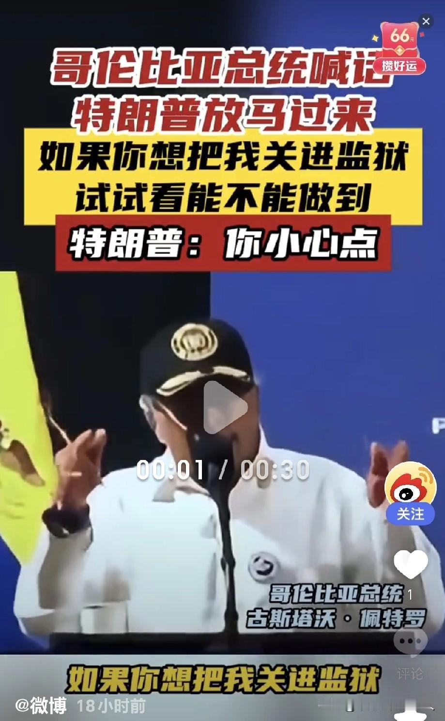 一句话逼一国进入战备! “哥伦比亚总统你小心点”,特朗普随口说的这句话竟让哥伦比亚直接拉响警报、进入紧急战备状态。 说起特朗普,“嘴炮”几乎是他的标志性标签。执政期间,他的发言常常语出惊人、打破常规,却总能在国际社会掀起不小的波澜。 很多人以为他的话不过是逞口舌之快,可这次哥伦比亚的反应却清晰地告诉我们:特朗普的“嘴炮”,威慑力从来都是拉满的。 究其根本,特朗普的底气从来不止于他个人的言辞风格,更在于他背后那个号称“星球最强”的霸权国家——美国。但这还不是最关键的原因。比起美国的硬实力撑腰,更让各国忌惮的是,特朗普从不是只说不做的“纸上谈兵者”,他是真的敢动手的“流氓政客”。 回顾他的执政履历,退群毁约如同家常便饭,经济制裁说用就用,军事威慑更是屡见不鲜。在他的逻辑里,没有什么规则道义,只有赤裸裸的利益和强权。这样一个手握超级大国权柄,又行事毫无顾忌的人,说出的一句威胁,怎么可能不让人后背发凉? 如果换作其他国家,哪怕是实力不俗的强国,恐怕也很难仅凭一句话就让另一个主权国家如临大敌。毕竟在国际社会,能把“言出必行”的威慑力,和“想打就打”的蛮横作风结合得如此彻底的,放眼全球,也就只有美国和它的铁杆盟友以色列。 抛开特朗普的霸道行径不谈,也赤裸裸地印证了一个残酷的现实:在霸权主义横行的国际丛林里,打一顿,远比一百次的抗议和交涉管用得多。