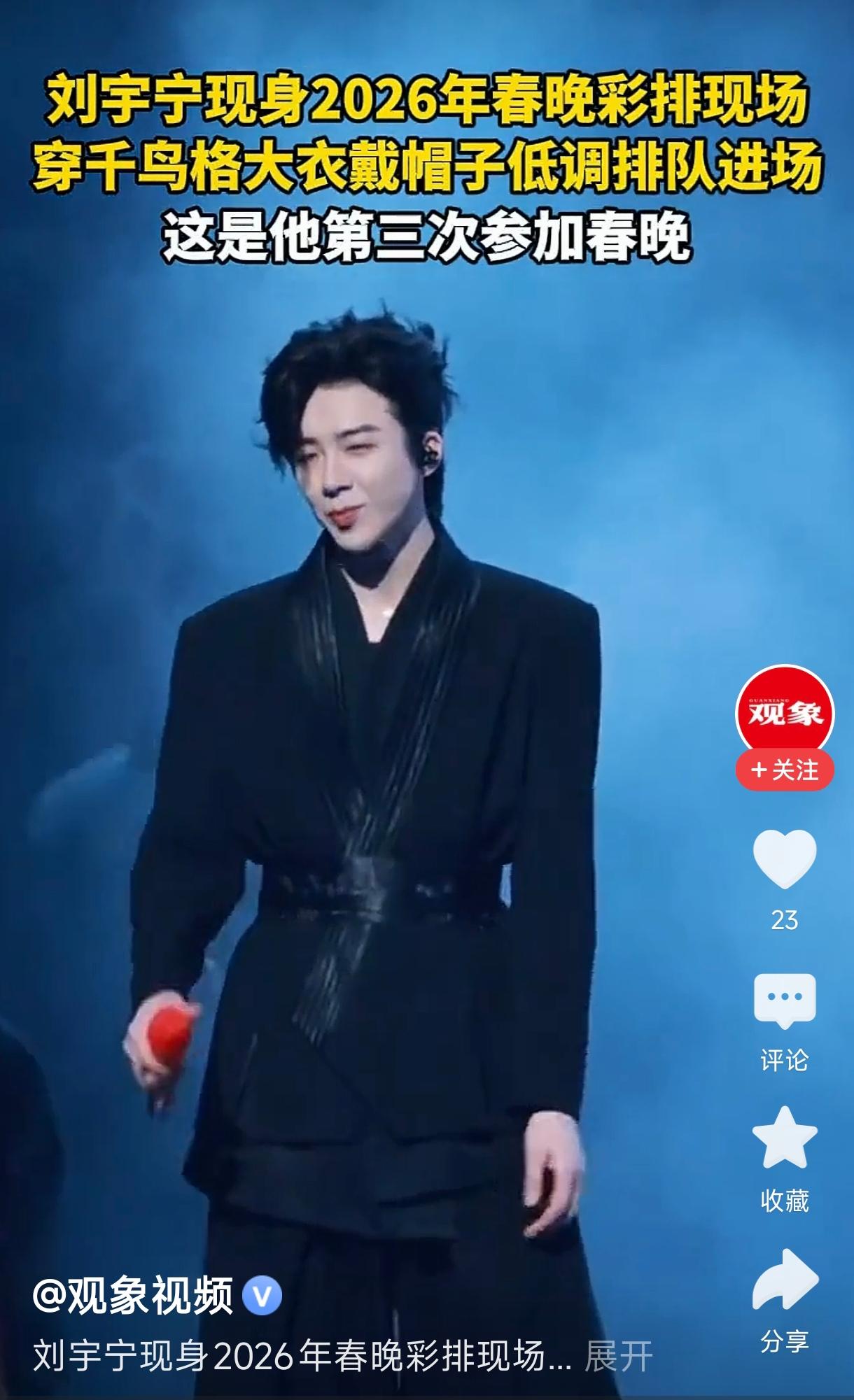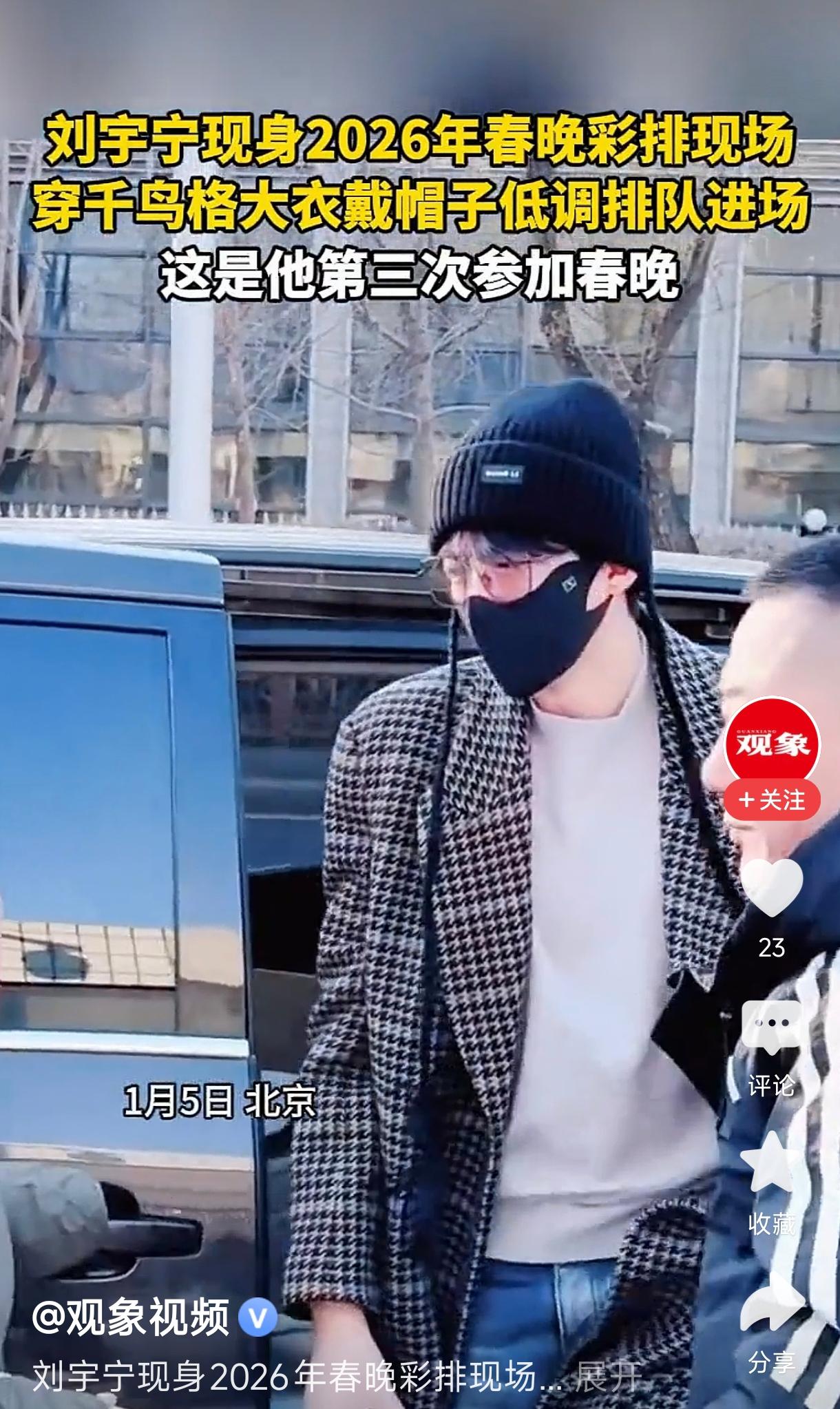 刘宇宁现身央视春晚彩排现场 感谢您的分享!刘宇宁作为当红歌手,能够亮相2026年春晚彩排现场,说明他在今年的春晚舞台上可能会有精彩表现。此次他穿着千鸟格大衣、戴帽子低调排队,展现出低调而不失时尚的风格,也体现了他对春晚的重视和谦逊态度。期待他在春晚上的精彩演出,为观众带来更多惊喜!刘宇宁唱歌 刘宇宁穿搭