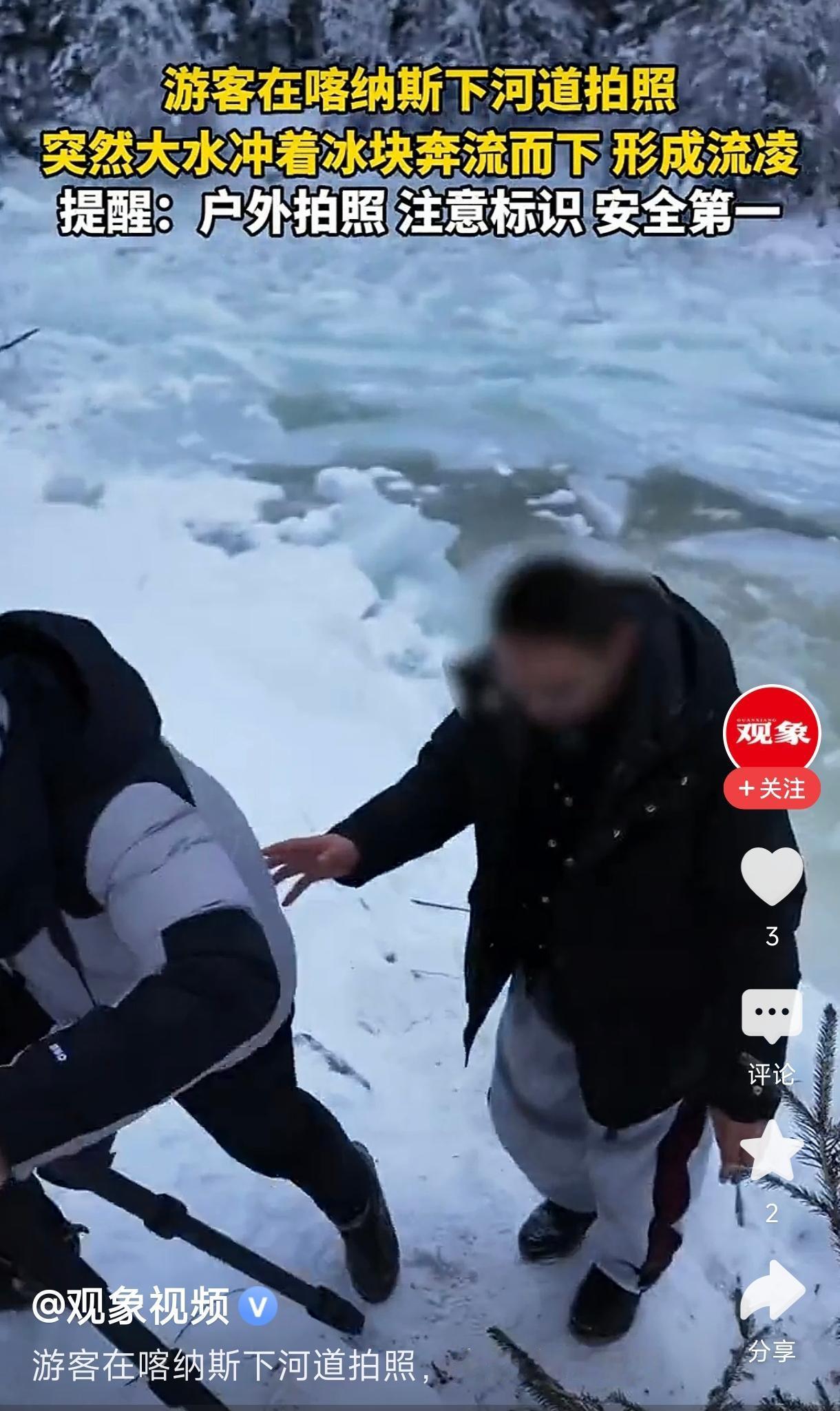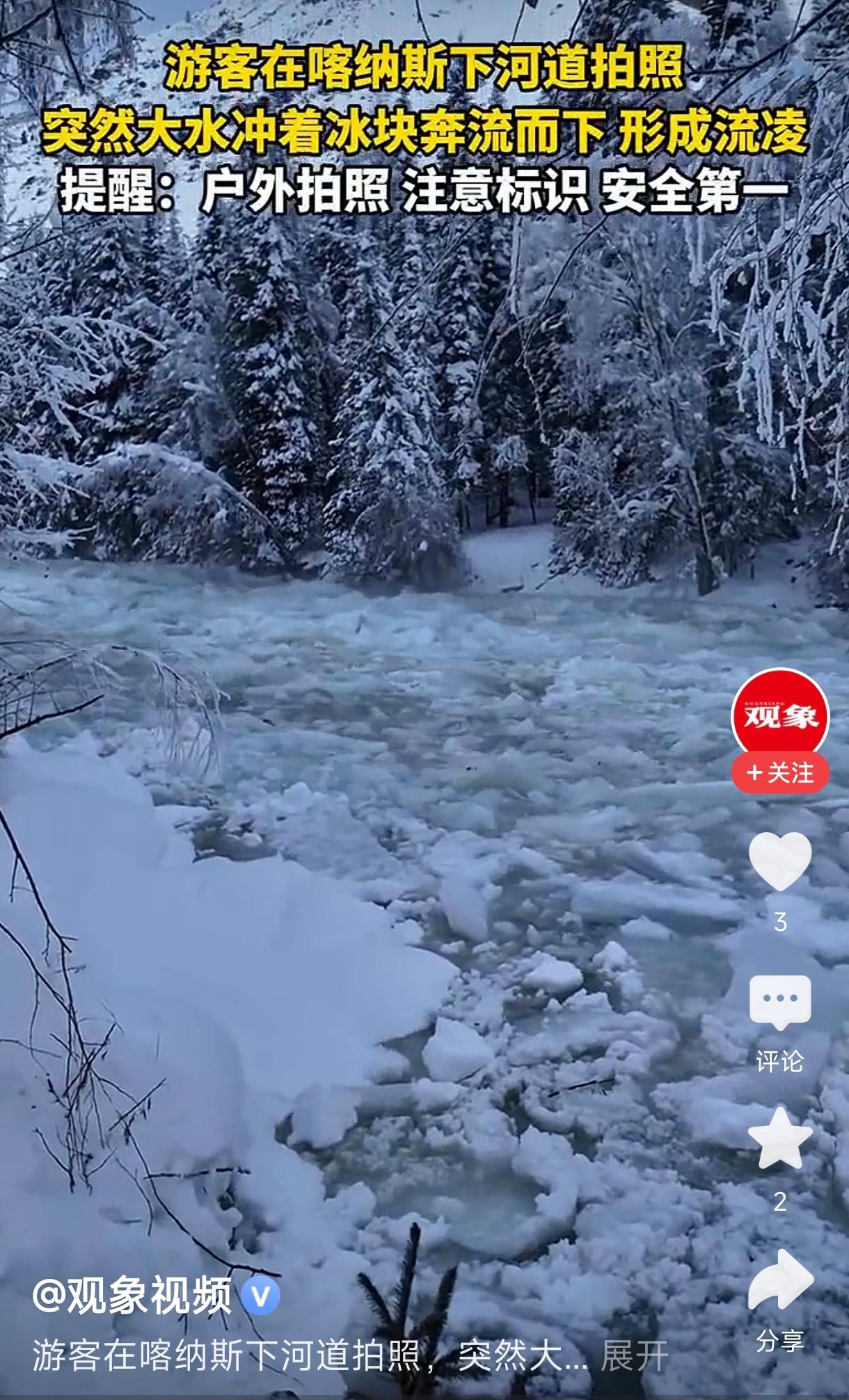 游客在喀纳斯下河道拍照突遇流凌 在喀纳斯下河道拍照的游客突然遇到流凌,这是一个非常危险的自然现象。流凌通常发生在冰雪融化和气温升高的季节,尤其是在春季,冰块在河道中被冲刷、破碎后形成巨大冰块或冰块堆积,随水流奔涌而下,形成流凌。 安全提醒: 遇到流凌时,应立即远离河道边缘,避免站在冰块可能冲击到的区域。 不要试图接近或拍摄流凌,以免被冰块击中或被水流冲走。 事发后,应迅速远离现场,通知相关安全人员或导游。喀纳斯 喀纳斯冰河