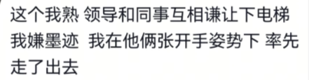 领导和同事互相谦让下电梯,我嫌墨迹,我在他俩张开手姿势下,率先走了出去