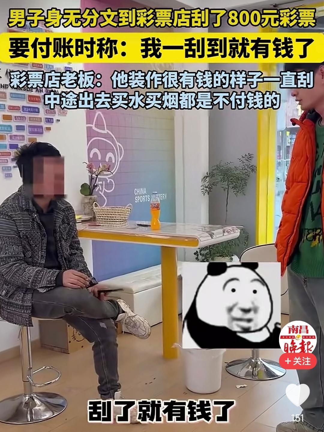 这辈子什么人都见过,唯独没见过这号人物。 河南许昌,一男子跑到彩票店刮彩票。一进店他就让老板娘把刮刮乐拿出来,然后坐在店里头都不抬的猛刮。 老板娘看他那架势,以为是个有钱人花钱来消遣娱乐的,全程也没拦着。可男子从头到尾也没刮出什么大奖,小奖加起来又不够抵账,不一会就欠下800多元。 这时,老板娘才察觉到有点不对劲,感觉这男的已经玩“上头”了。于是,赶紧劝他别刮了,先把账给结了。可没想到,男子却来了句“我身上没钱”,直接让老板愣住。 这句话直接把老板娘给整不会了。她一脸诧异的问:“你没钱怎么还敢来刮那么多彩票?”男子的接下来的回复差点让老板娘当场休克“等刮出奖就有钱了” 。 更加让人傻眼的是,警察到场后了解到这男子竟是个惯犯,打车不付车费,刮彩票期间还跑去便利店买水买烟也没有付钱。 网友调侃:“原来买彩票也能白嫖,合着中奖就买单,没中奖就不用给钱了?” 关键是警察也拿这种身无分文的人没有办法,无奈只能让男子把身上的手机压在这,有钱再赎回去。 可老板娘一看他掏出的那台破手机,心都凉了!又破又旧还是个杂牌,估计一百块都没人要,只能自认倒霉了。 不过这也怪老板娘,谁叫她不让男子先付钱呢?这不给了某些人“空手套白狼”的机会吗? 最后奉劝大家,博彩可不是脱贫的捷径,想靠运气赌明天,机率太渺茫了。