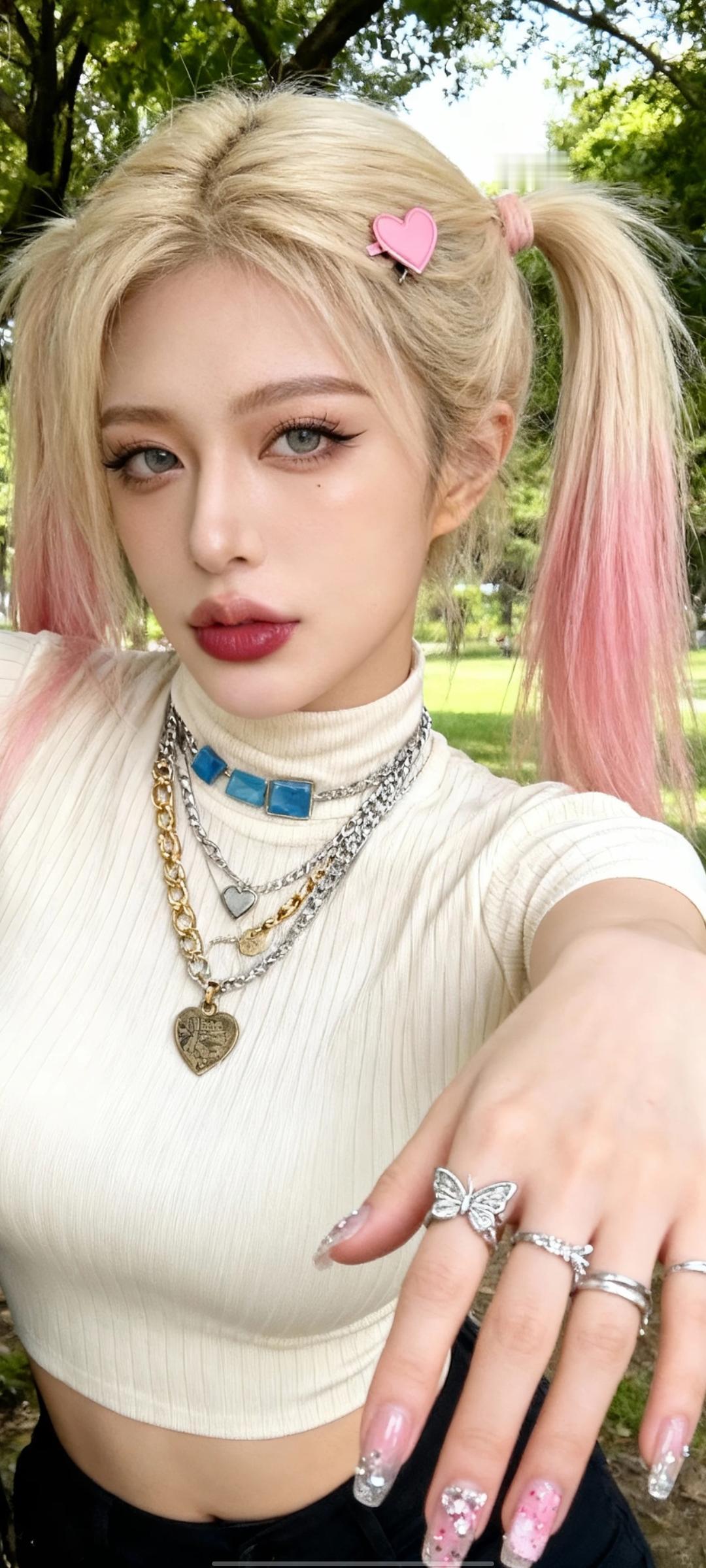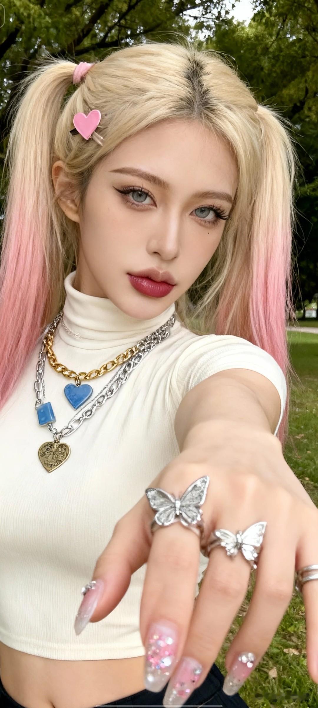 项链:混搭风颈链(蓝色几何树脂块+金色金属链+复古钱币吊坠) xhs美女,空灵感,自然感,白月光感,发饰,耳坠,楚楚,淡淡的幸福,高分点赞多优先,视觉捕捉点,疲惫,依靠,回头,一只手伸向镜头,很不情愿的在,写真,穿着,8k极高清,前视角,湿润,拥挤房间,浅金色双马尾(粉色渐变发尾),粉色心形发夹,米白色高领短款上衣,多层银色项链(心形吊坠),多枚银色戒指(蝴蝶造型),粉色亮片美甲,Y2K风格,甜美街头元素,粉色少女感你心中的女神啥样