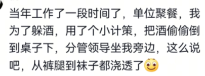 把酒偷偷倒到桌子下,分管领导坐我旁边,这么说吧,从裤腿到袜子都浇透了