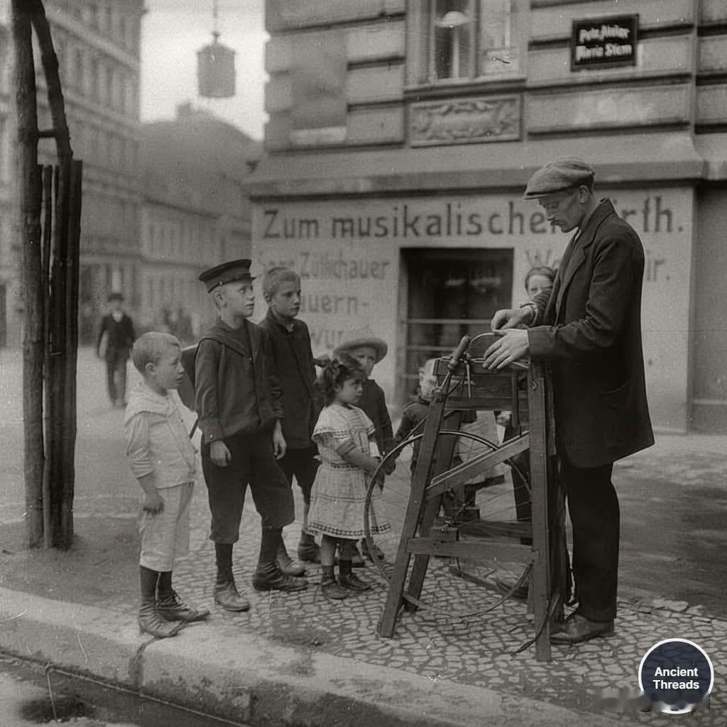 1904年,德国柏林街头的磨刀剪师傅,引来一帮幼童驻足观看。