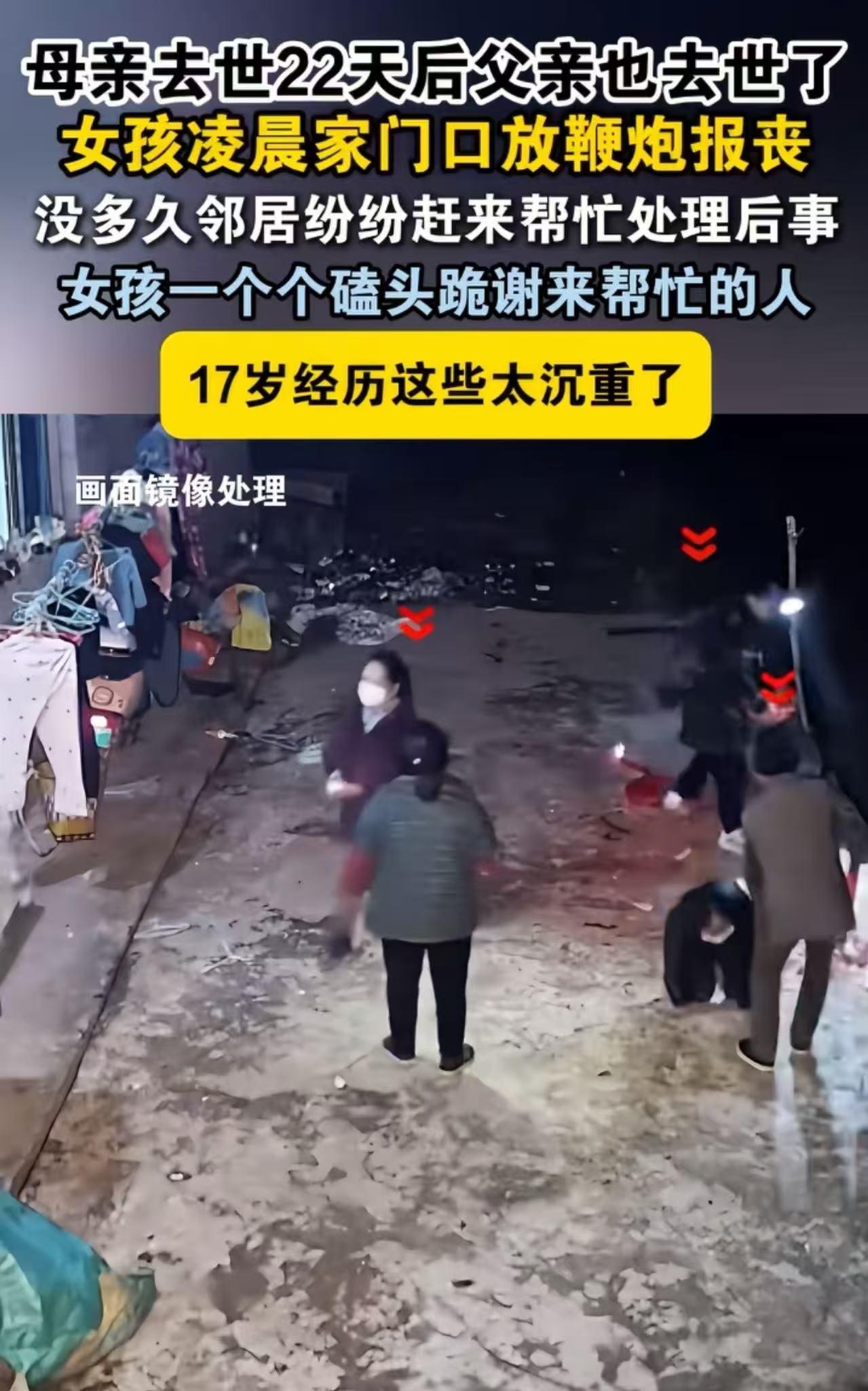 太令人心痛了!母亲去世才22天,父亲也去世了,17岁女孩凌晨在家门口放鞭炮报丧,没多久邻居纷纷赶来帮忙处理后事,女孩一个动作,令人泪目!网友:17岁经历这些太沉重了! 这世间最让人痛彻心扉的,莫过于接二连三地失去至亲。17岁的女孩,在短短22天里,先后经历了母亲和父亲的离世,那场景,任谁听了都会忍不住红了眼眶。 女孩的母亲因病去世,父亲沉浸在巨大的悲伤之中,无法自拔。 女孩以为时间能抚平伤痛,父亲总有一天会重新振作起来。可谁也没想到,过度的悲痛竟击垮了他的身体——悄然闭上了眼睛。 那晚,万籁俱寂,寒风刺骨。女孩守在父亲床前,看着最后一丝呼吸消散,整个人陷入巨大的恐慌和无助。 她才17岁,还是个孩子,却要独自面对双亲接连离世的噩耗。没有大人,没有主心骨,连该打给谁都不知道。 突然,她想起母亲去世那天,父亲曾在院门口放了一挂长长的鞭炮。 村里老人说,这是老规矩——白事放炮,不是为了热闹,而是向四邻传递一个信号:“我家有丧,请来帮把手。” 于是,她翻出家里剩下的鞭炮,踉跄走到门口,用冻得发抖的手点燃。 “噼里啪啦——” 清脆又凄凉的爆竹声划破深夜,惊醒了整个村子。 大家没有一句抱怨,没有一丝犹豫,听到炮声,立刻明白发生了什么。 他们迅速披衣下床,纷纷赶往女孩家。 当亲戚、邻居陆续进门,女孩什么话也没说,朝着每一位前来帮忙的人,深深磕了一个头。 那一个个响头,磕在地上,也磕在每一个人的心上,让人看了忍不住泪目。 那一刻,她瘦小的背影在昏黄灯光下微微颤抖,却撑起了整个家最后的体面。 此事引发热议,有网友说,那年我十九岁,我妈肝癌去世了,正赶上割麦农忙时,我爸跟村小组几家人说拜托大家了,人家回说不用拜托,哪怕再忙天塌了都是小事儿,一定准时到帮忙,丧事完了连续好多天雨,家家麦子都上了灰!这就是农村人善良和热情! 也有网友说,看着我泪目,我父母不在的时候,只要去殡仪馆的,我都下跪感恩,我深知红事是锦上添花而白事是雪中送炭,父母的丧事都很圆满!可这孩子才17岁啊,她的爸妈得多心疼让自己的女儿独自面对这个社会呀! 还有网友说,放鞭炮是告知乡里乡亲们家有事了,可我们这禁烟火禁的红白事都不让放鞭炮了,有事了乡里乡亲的都不知道! 我想说的是,这个17岁女孩点燃的不只是鞭炮,更是对传统乡土社会最后的信任。 在城市化浪潮冲刷下,许多乡村正在失去它的温度——熟人社会瓦解,互助精神式微,连“报丧”的声音都被禁令掐灭。 可正是这些看似“落后”的习俗,构成了底层最坚韧的安全网! 女孩,用最古老的方式告诉我们——有些善意,不该被现代化“优化”掉;有些声音,值得被允许在黑夜中响起。 农村这种互帮互助的传统美德,就像一股清泉,滋润着我们的心灵。我们应该珍惜这种美德,传承这种精神,让社会变得更加温暖、更加有人情味。 同时,我们也应该给予这些遭遇不幸的人更多的关爱和帮助,让他们感受到社会的温暖,不至于在困境中独自挣扎。