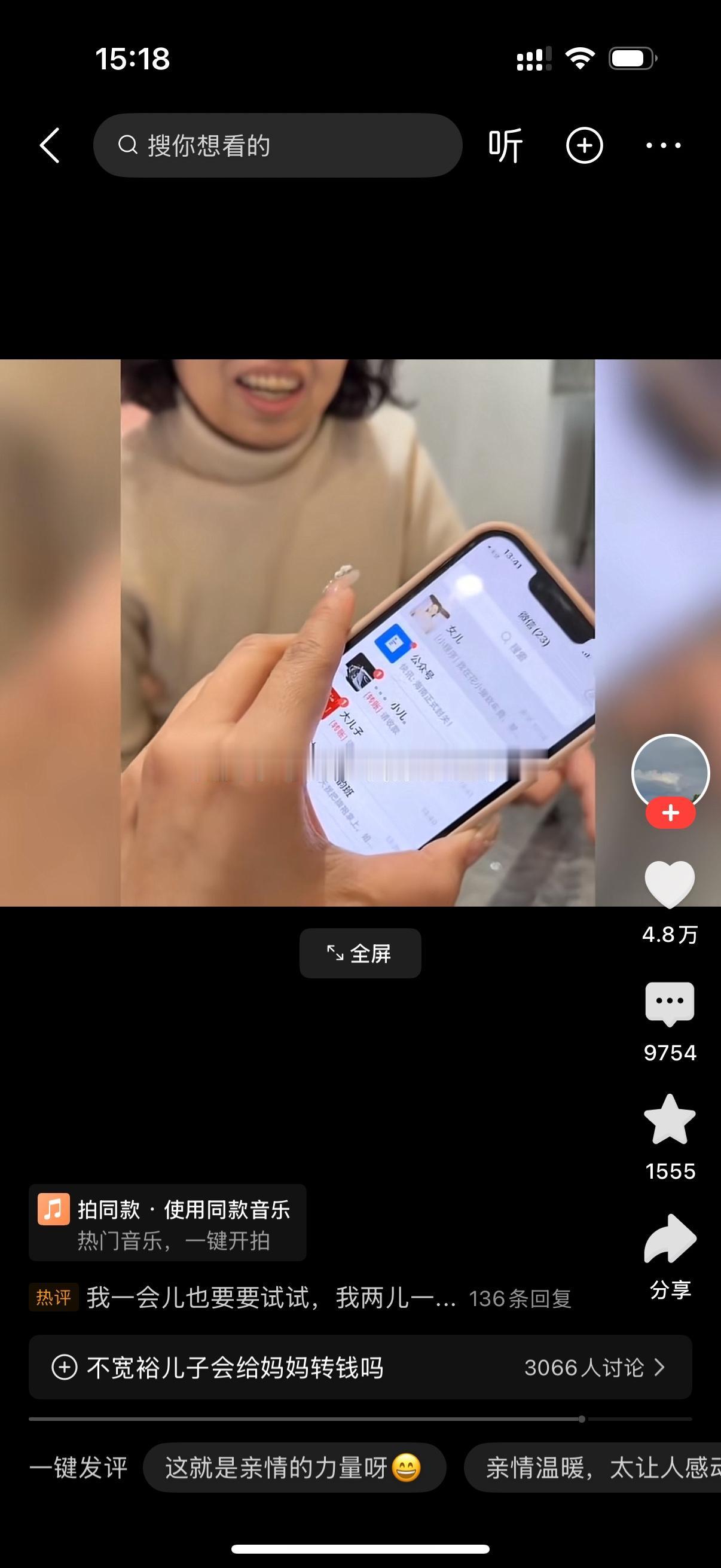 小姨让自己的姐姐给两个儿子打电话要1000块钱,看看能要上么?姐姐先给大儿子打电话说,我在逛街看到一对镯子,要1000块钱,你有么?大儿子回答,咋没有了,我现在就给你转过去。不一会,钱就到了。妈妈又给小儿子打电话,电话通了,妈,啥事了?妈妈说,我现在逛街看到一对镯子,1000块钱了。小儿子说,嗯。妈妈问,你嗯什么?不知道我啥意思么?小儿子说,知道,我马上给你转过去。不到一秒,小儿子就把钱转过来了。妹妹问姐姐,这钱你收吗?姐姐说,我不收,他们也不容易。说着,这个妈妈泪湿了双眼,两儿子太孝顺了。