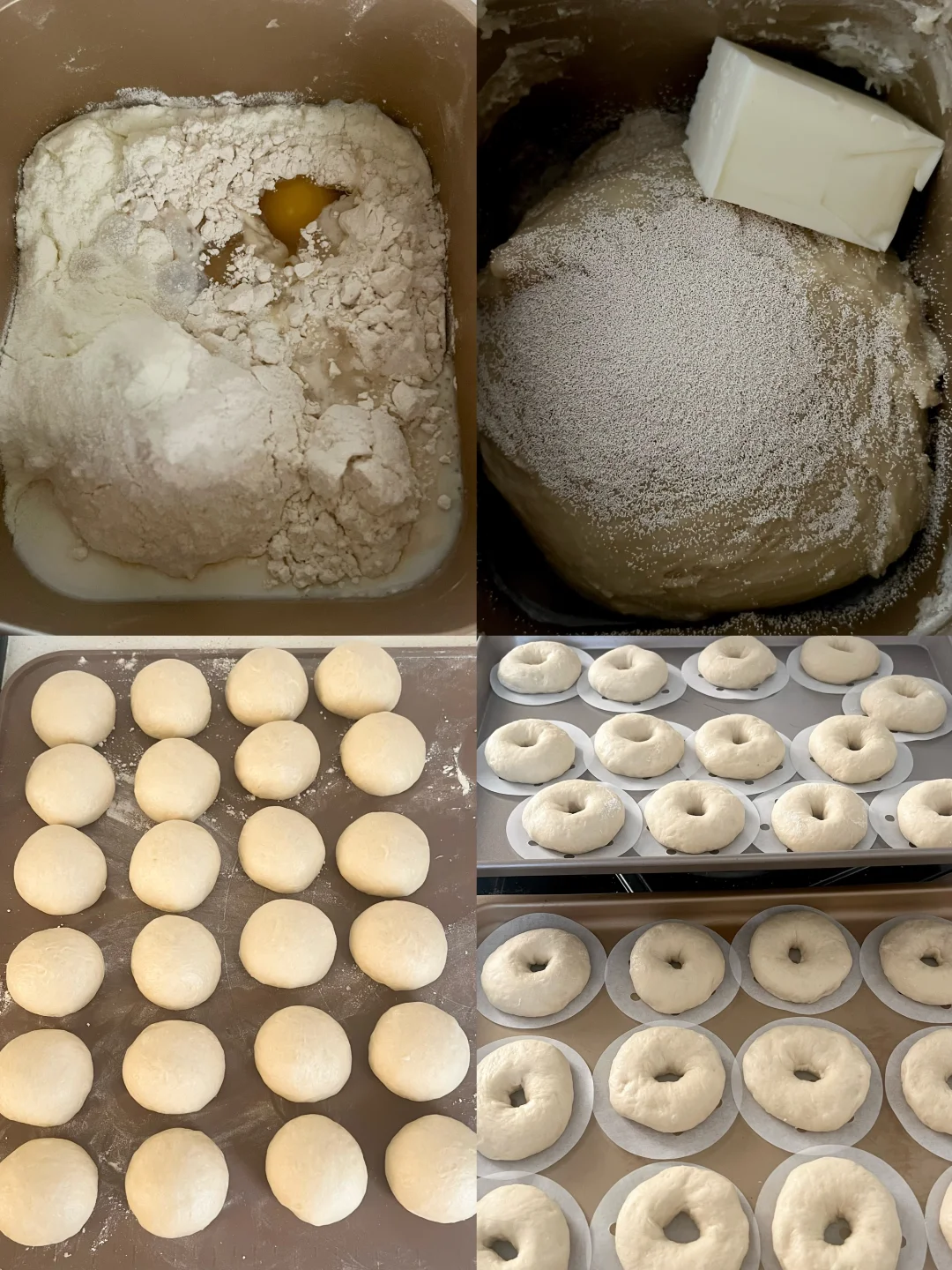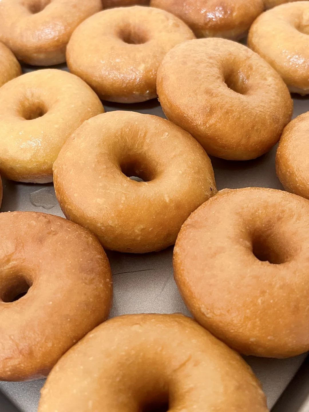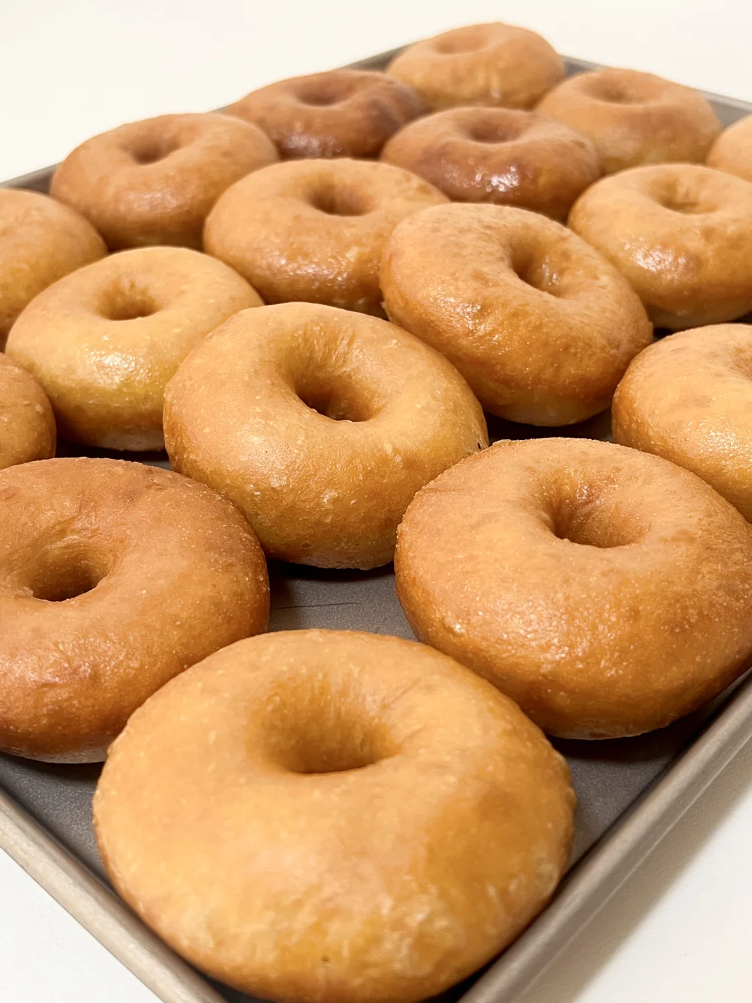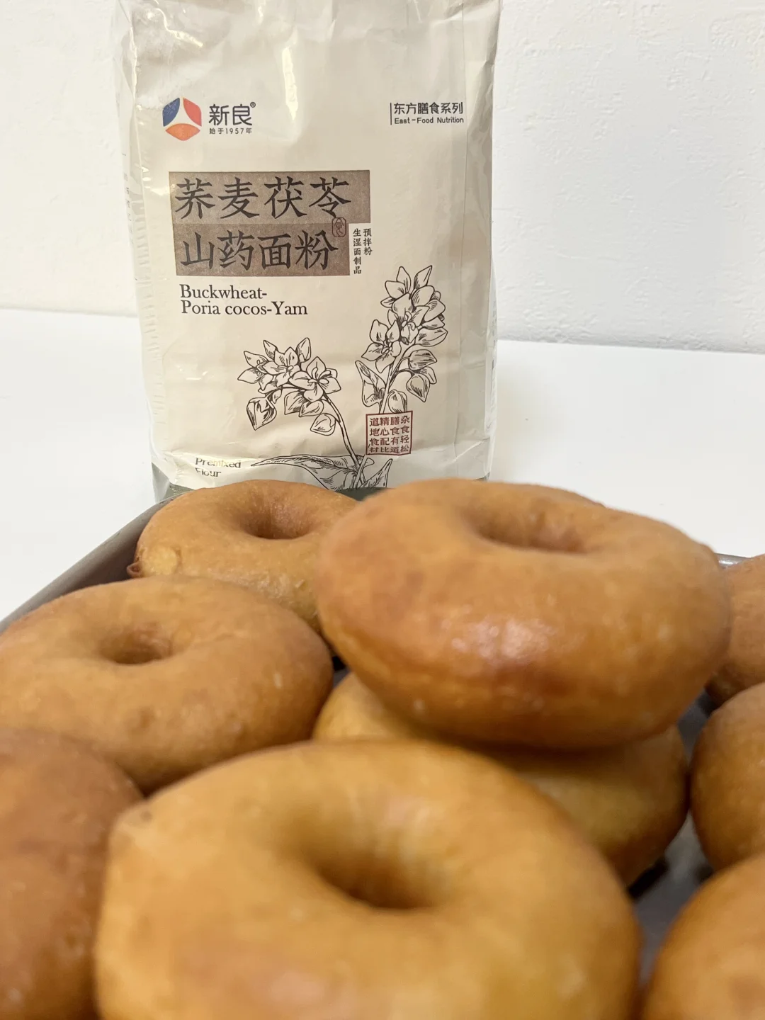 【所需食材】 新良荞麦茯苓山药面粉600克|细砂糖100克|奶粉30克|鸡蛋2个|牛奶330克|盐3克|干酵母6克|无盐黄油60克 【制作过程】 1⃣️除了黄油之外的所有材料揉至粗膜后加入黄油揉均匀 2⃣️面团向下收圆,盖上保鲜膜松弛10分钟 3⃣️松弛好的面团按压排气,平分成12份,分别滚圆,中间戳洞,底部垫油纸 4⃣️在温暖湿润的环境下发酵,可以放在烤箱里,开启发酵功能,烤箱里放一碗热水增加湿度 5️⃣发酵至体积1.5倍大,小火油炸至两面金黄即可