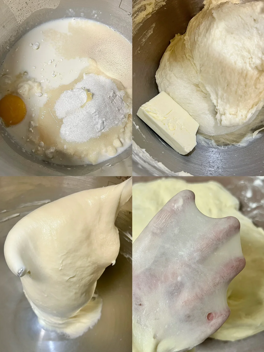 1⃣️把除了黄油以外的吐司材料全部放入厨师机中(先加液体后加粉类,糖和酵母分开放)面团揉至光滑、能拉出大片比较厚的膜之后加软化的黄油揉至手套膜