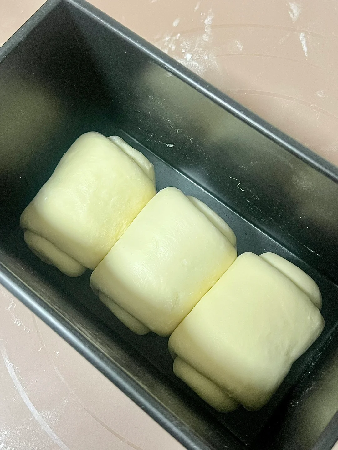 2⃣️揉好的面团不需要一发,直接平分成3个滚圆,取一个面团擀开,擀长,两边向中间折起,再自上而下卷起,三个都卷好,放入吐司盒