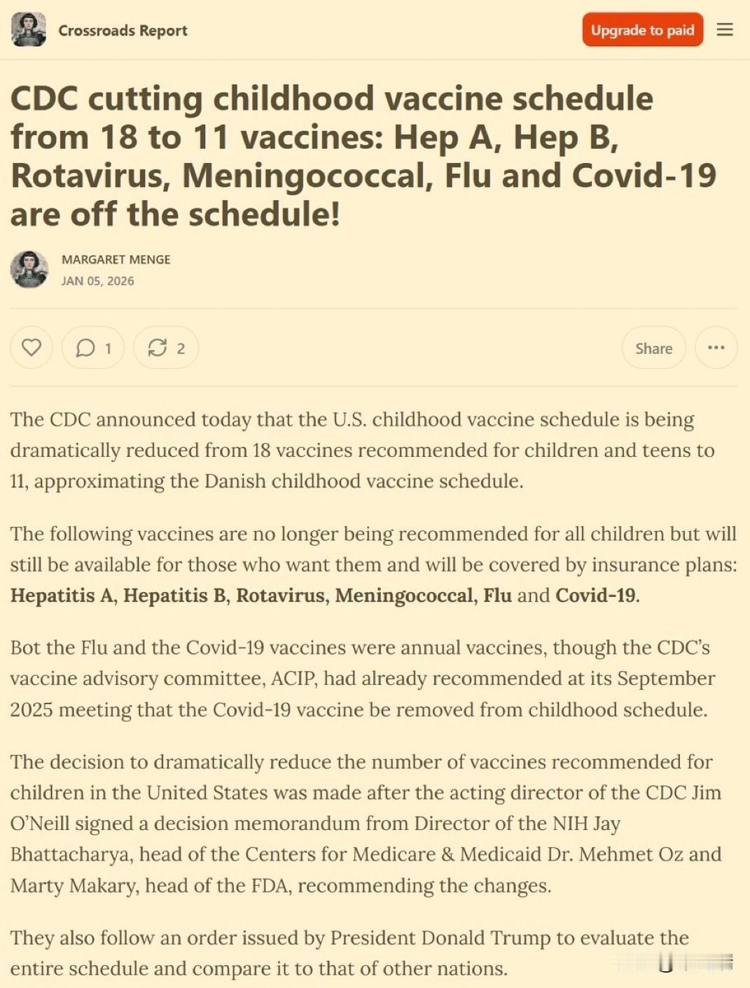 根据 2026 年 1 月 5 日的最新官方动态,美国疾病控制与预防中心(CDC)宣布了对儿童免疫程序的重大调整,将普遍推荐(Universally Recommended)的疾病预防种类从原来的 17 或 18 种削减至 11 种。 以下是核心事实: 1. 免疫程序的具体变化 CDC 将疫苗分为三个层级,不再对所有儿童普遍推荐针对 17-18 种疾病的疫苗,而是缩减为针对 11 种疾病的常规接种: 普遍推荐(11 种): 白喉、破伤风、百日咳、乙型流感嗜血杆菌(Hib)、肺炎球菌、脊髓灰质炎、麻疹、腮腺炎、风疹、水痘以及人类乳头瘤病毒(HPV,改为仅需一剂)。 高风险群体推荐: 乙肝、A 型肝炎、脑膜炎、登革热和呼吸道合胞病毒(RSV)疫苗现在仅推荐给特定的高风险儿童。 共同临床决策: 流感、新冠(COVID-19)和轮状病毒疫苗被归入此列,需由家长与医生沟通后决定是否接种。 2. 政策背景 这一调整源于 2025 年底发布的总统备忘录,旨在参考丹麦等发达国家的做法,建立一个更“精简”且更符合国际共识的接种程序。 FDA 的角色: 虽然该指令通常被称为 HHS 或 CDC 的政策调整,但它与特朗普政府推动的“清理”或“审查”现有疫苗程序的指令一致。 3. 保险与覆盖 尽管“普遍推荐”的种类减少,但 HHS 官员(如 Dr. Oz)及各大保险公司确认,目前所有 CDC 推荐的疫苗仍受保险覆盖,家长不会因为推荐等级的改变而承担额外的自费费用。 普遍推荐的接种计划确实已从 17-18 种削减至 11 种,这一变化于 2026 年 1 月正式生效。