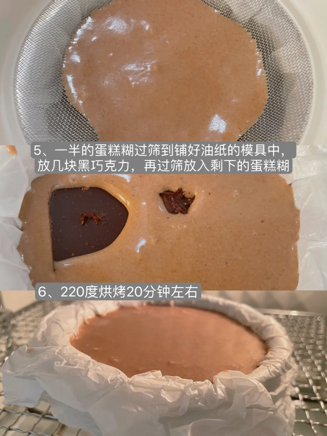 5⃣️一半的蛋糕糊过筛到铺好油纸的模具中,放几块黑巧克力,再过筛放入剩下的蛋糕糊,烤箱预热后,220度烘烤20分钟左右,烤好后晾凉冰箱冷藏至少4小时