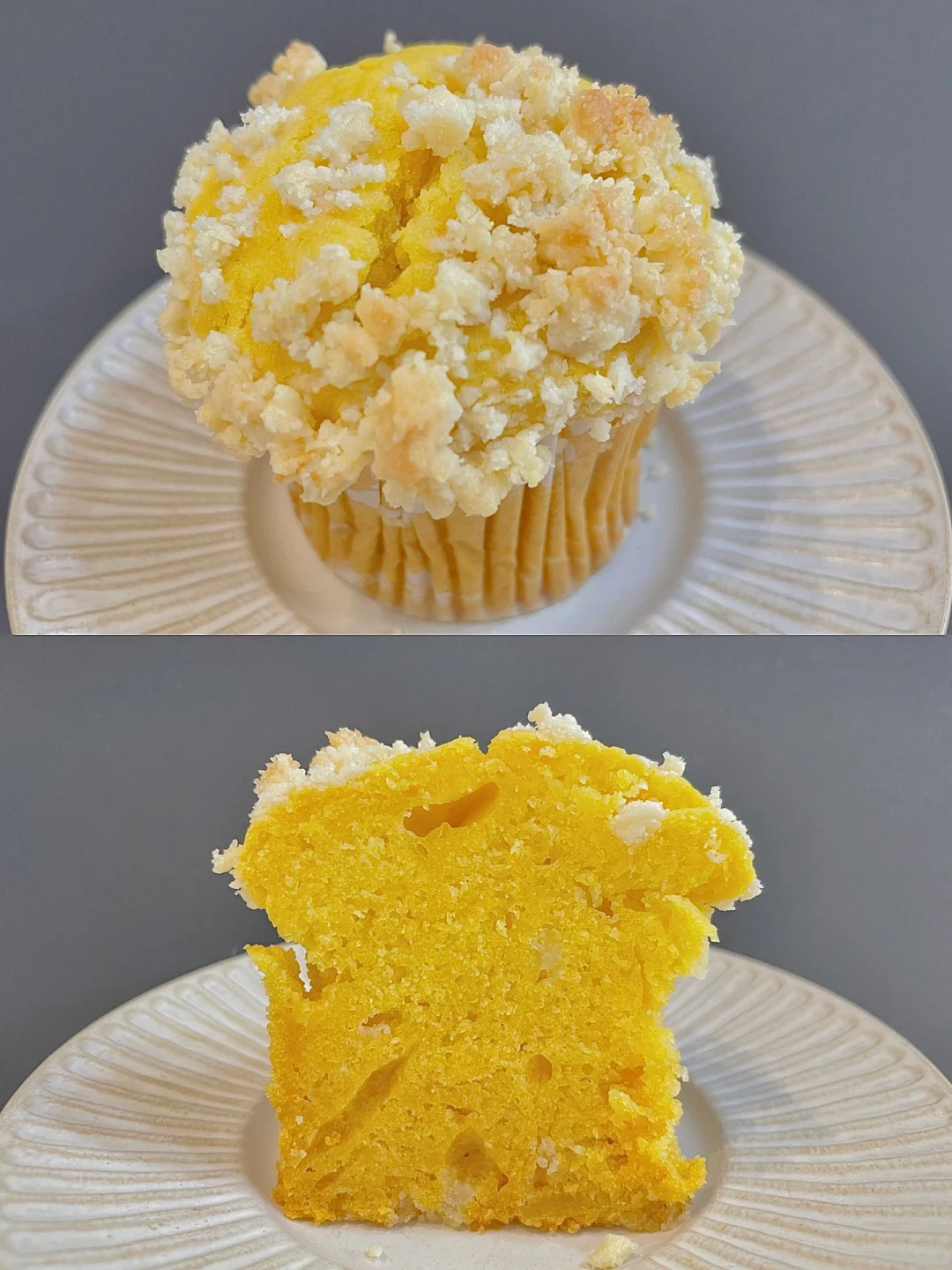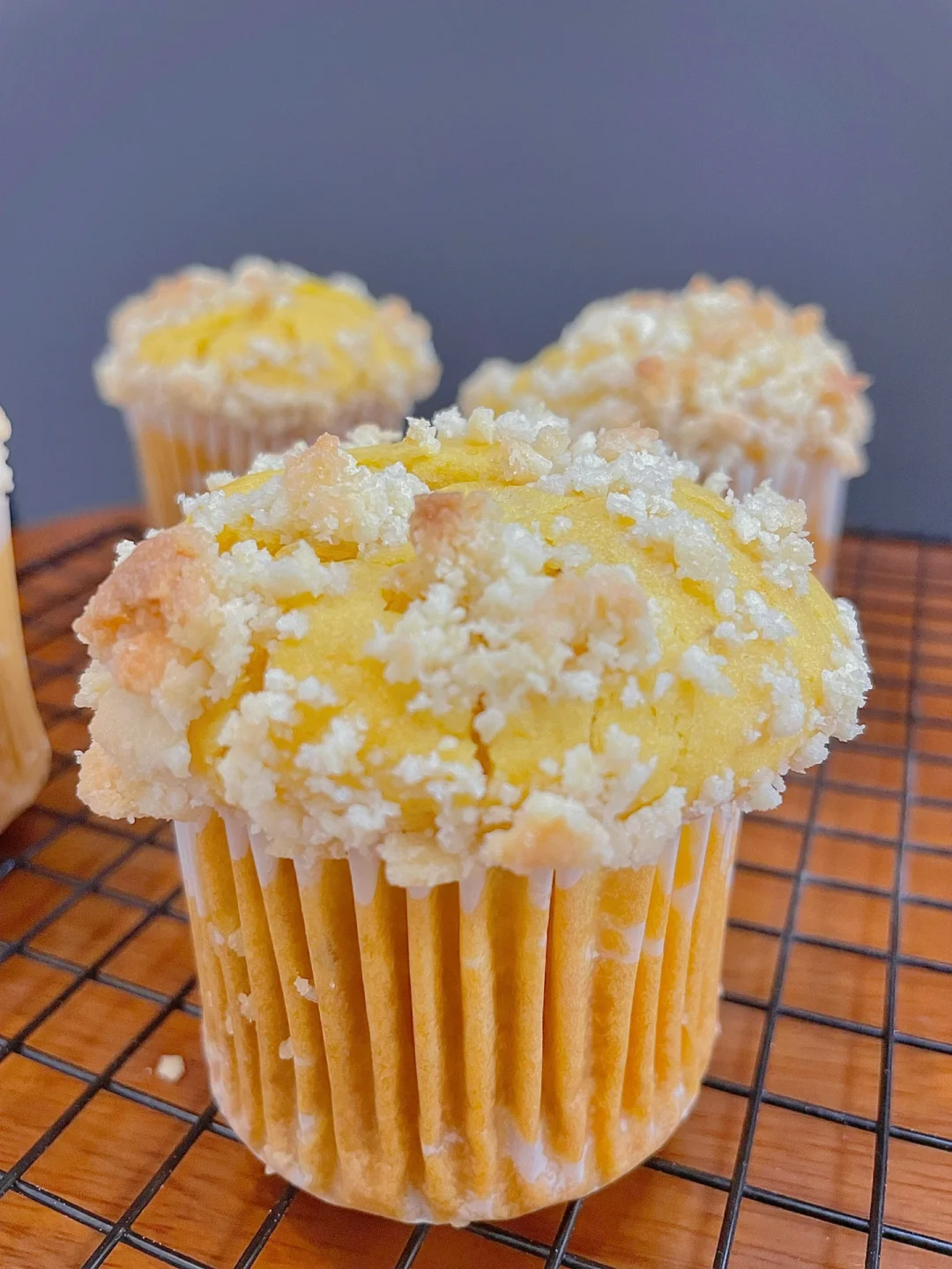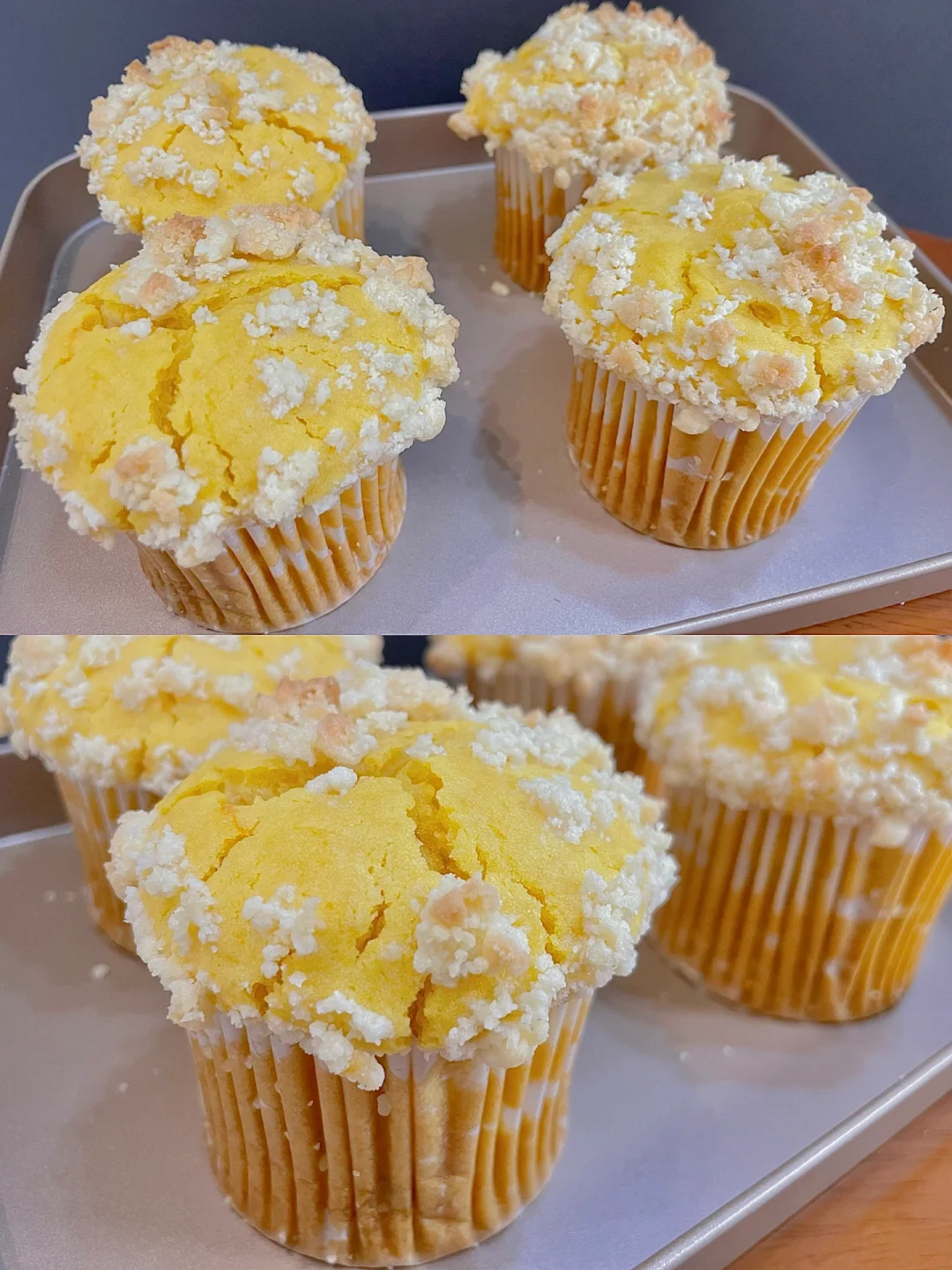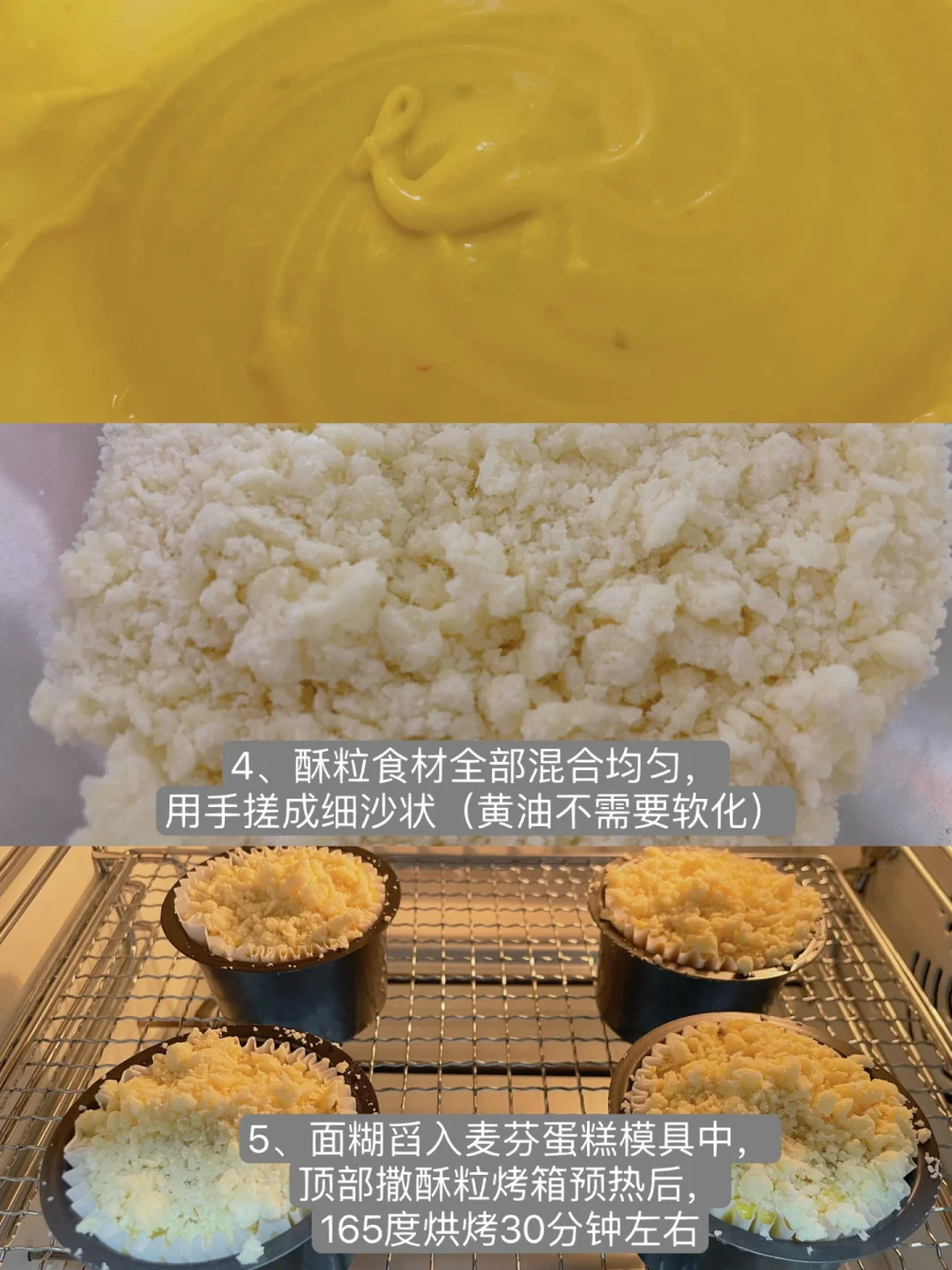 5⃣️面糊舀入麦芬蛋糕模具中,顶部撒酥粒烤箱预热后,165度烘烤30分钟左右(具体烘烤时间和温度需按自己家的烤箱调整)