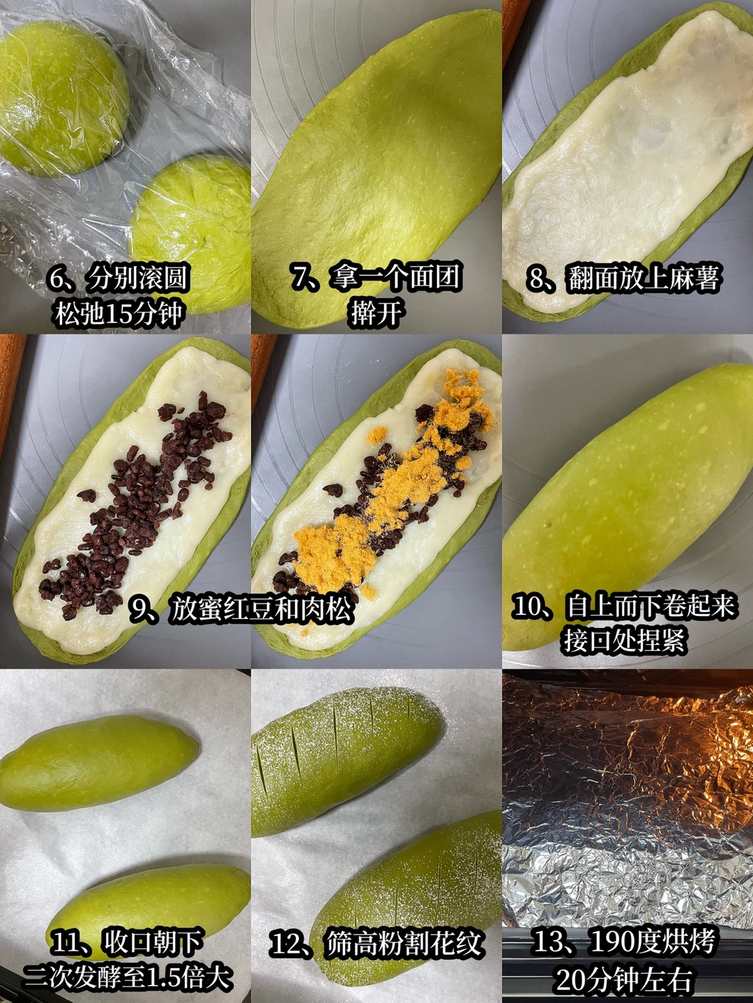 5⃣️拿一个面团,擀开,翻面放上1/2麻薯,蜜红豆和肉松(馅料可以按自己喜欢多放点,但是也不能贪心放太多,烤的时候容易爆开,也不好收口)自上而下卷起来,接口处捏紧,收口朝下放到烤箱里进行二次发酵