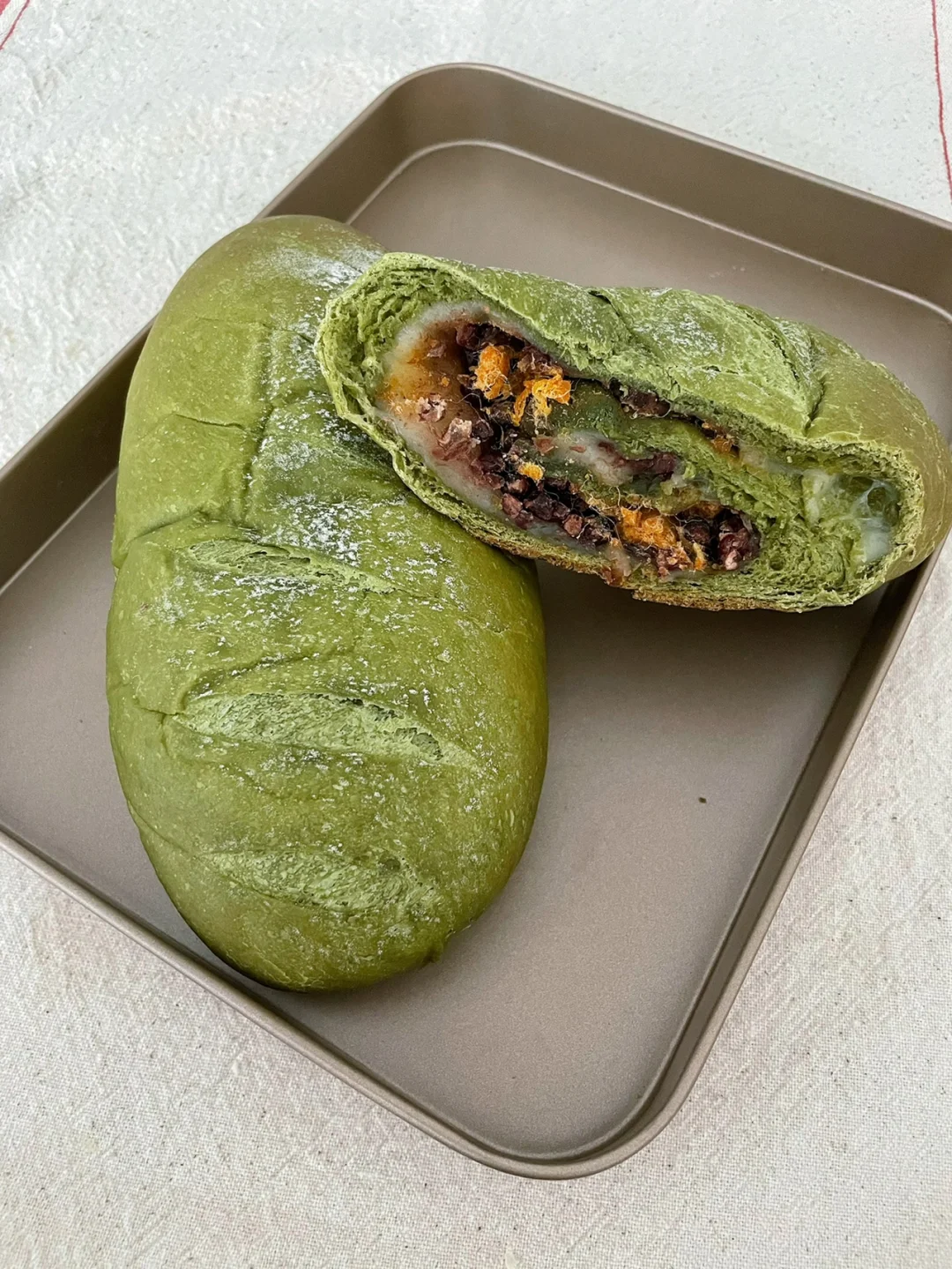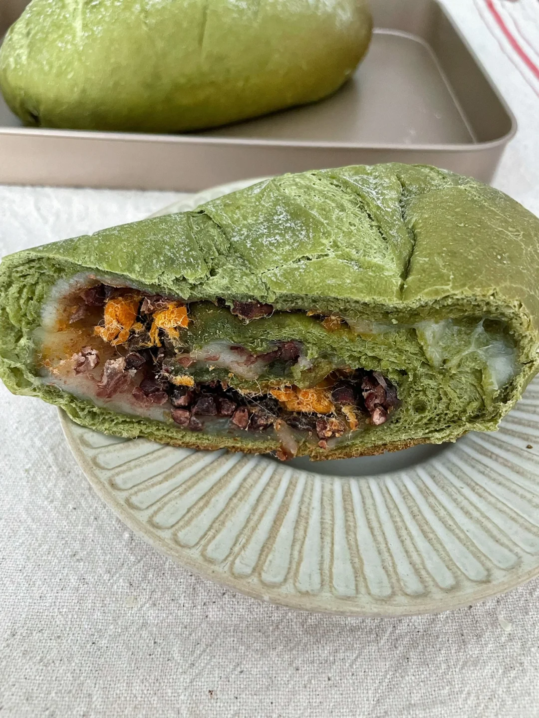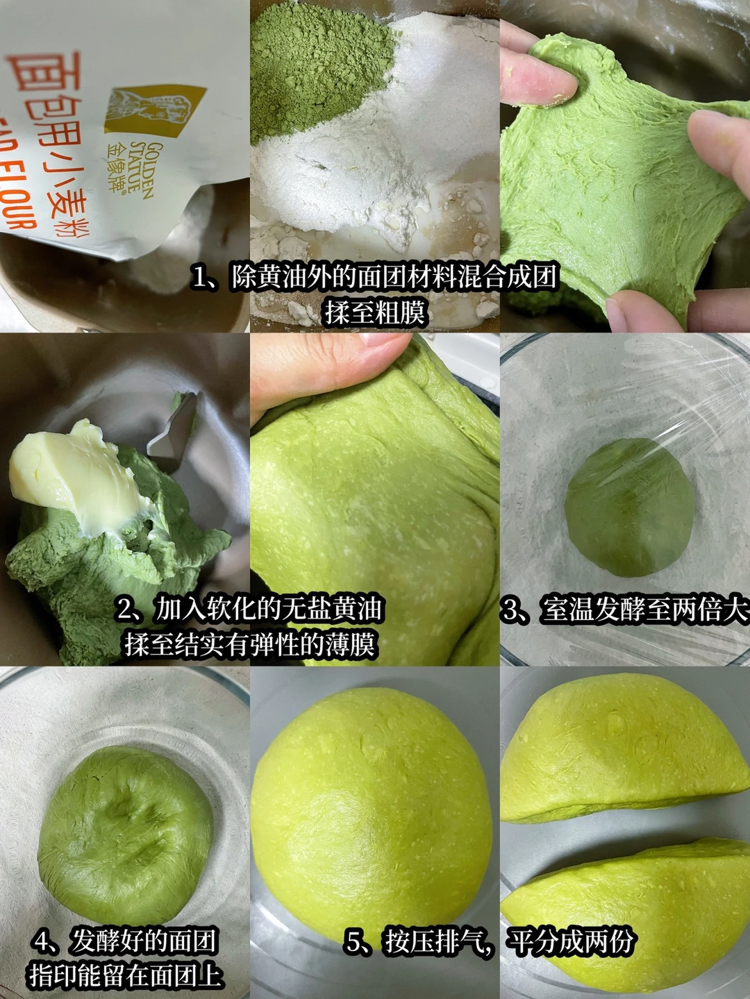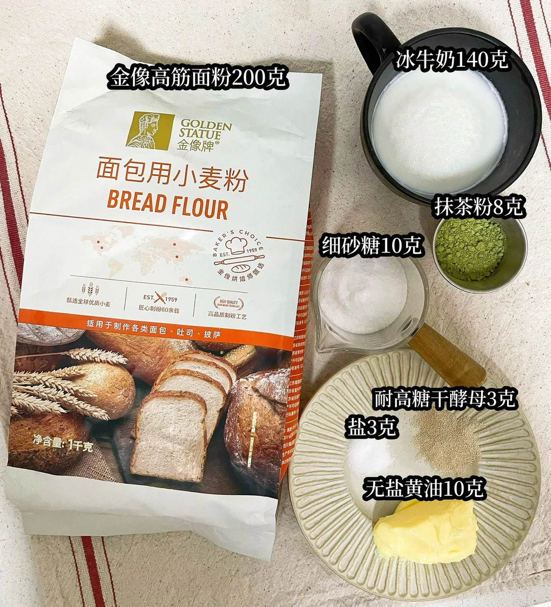 金像高筋面粉200克|冰牛奶140克|抹茶粉8克|细砂糖10克|耐高糖干酵母3克|盐3克|无盐黄油10克