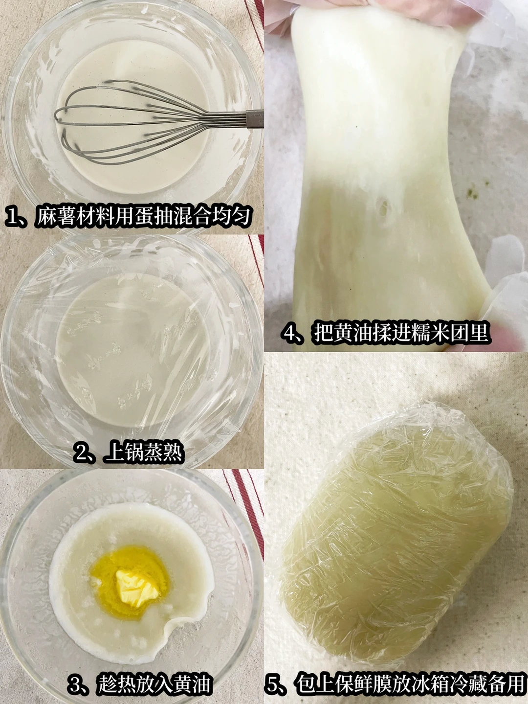 1⃣️麻薯材料用蛋抽混合均匀(除黄油外),盖保鲜膜上锅蒸熟(大约需要15分钟),没有液体就是熟了。趁热放入黄油,不烫手后把黄油揉进糯米团里,拉扯十几次,麻薯口感更好,(全程带一次性手套,不然很粘手)。之后包上保鲜膜放冰箱冷藏备用。