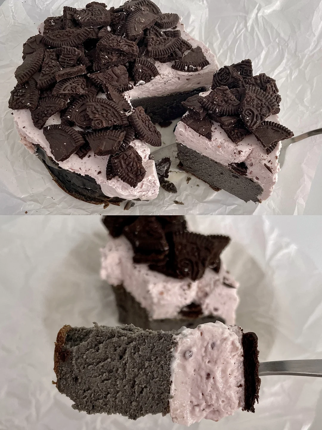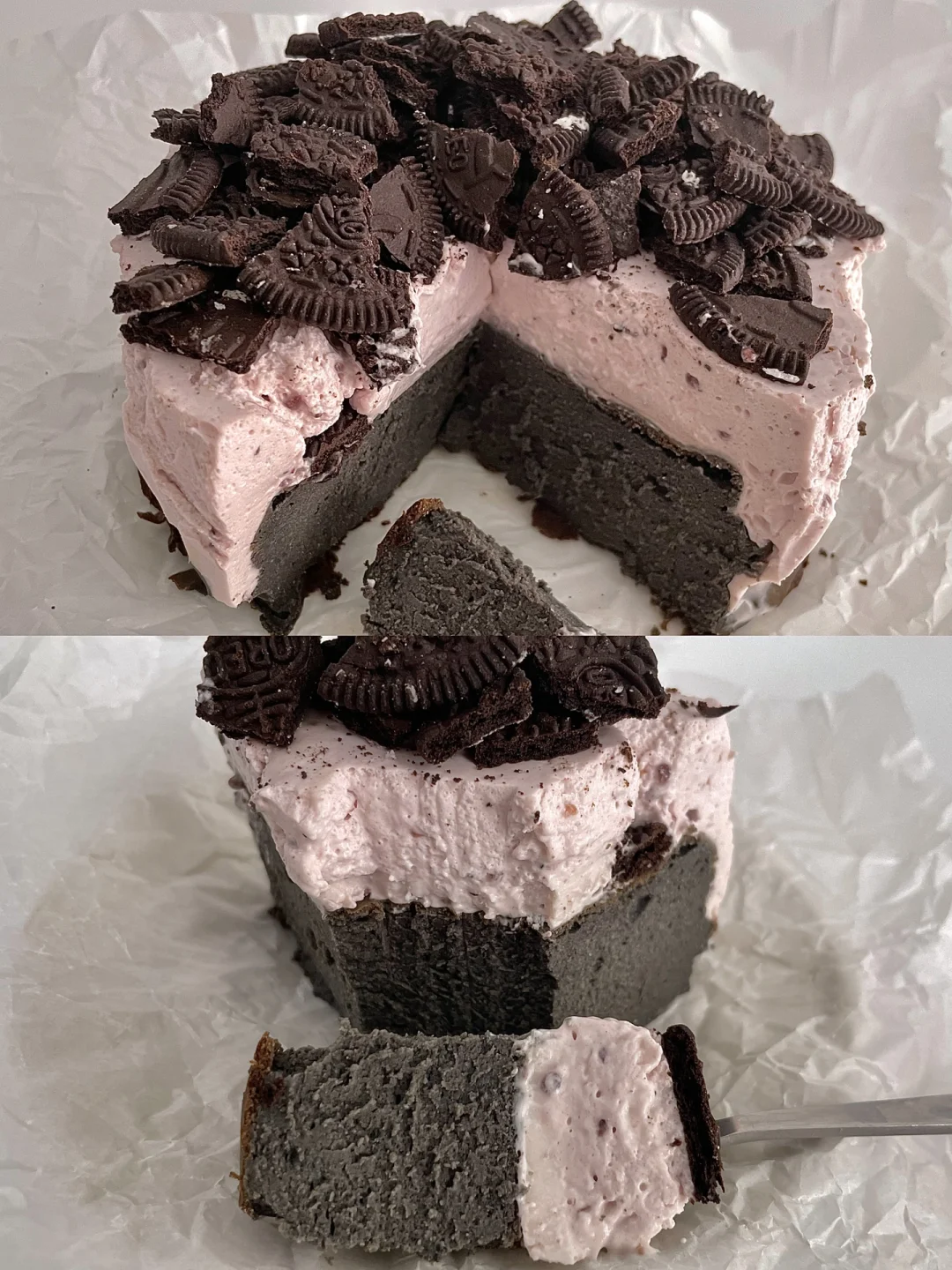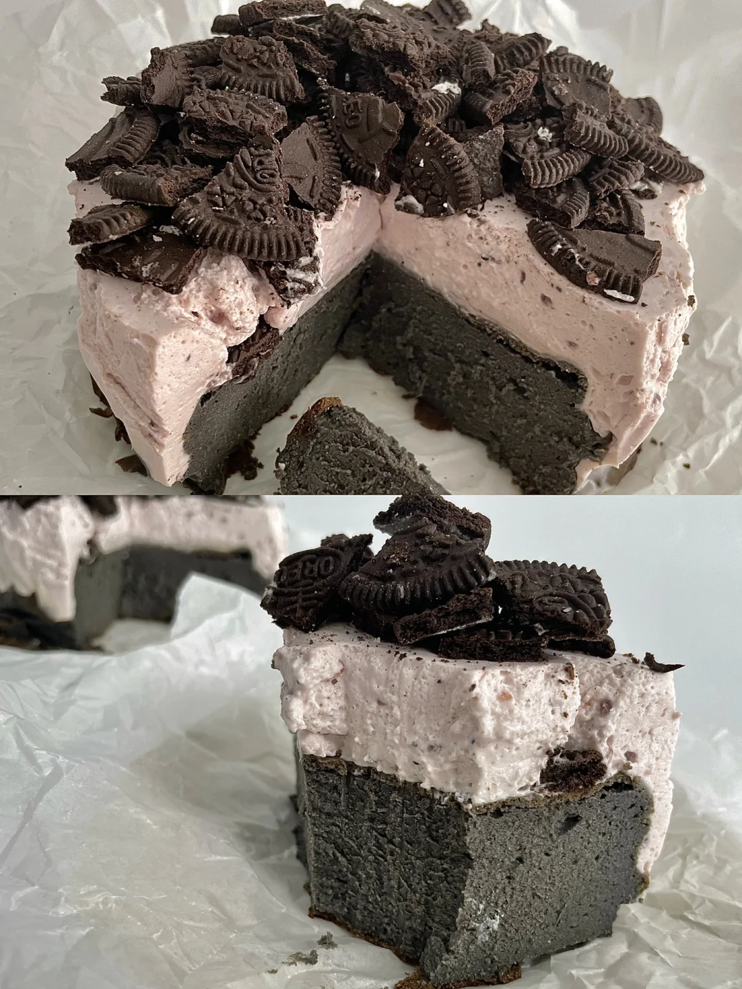 8⃣️淡奶油加入草莓酱打发至浓稠,加入牛奶吉利丁液,搅拌均匀,倒在巴斯克上面,冰箱冷藏至少4小时,取出表面放奥利奥饼干碎即可
