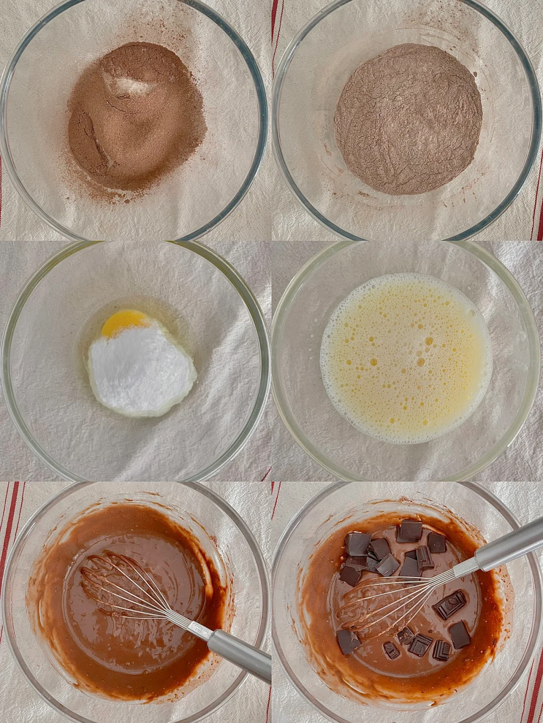 1⃣️所有粉类(低筋面粉、玉米淀粉、泡打粉、淀粉、可可粉和奶粉)一起过筛到大碗中,蛋抽混合均匀