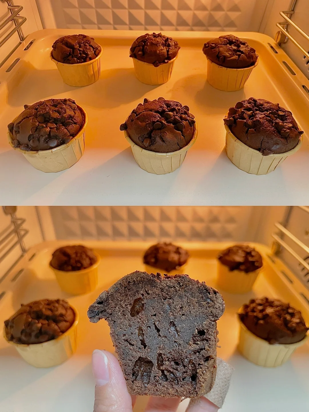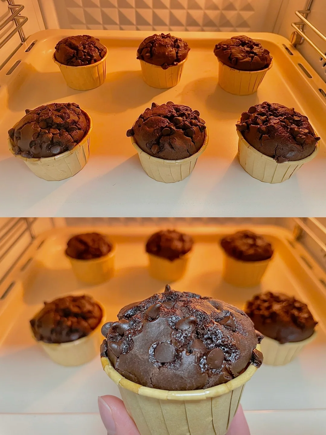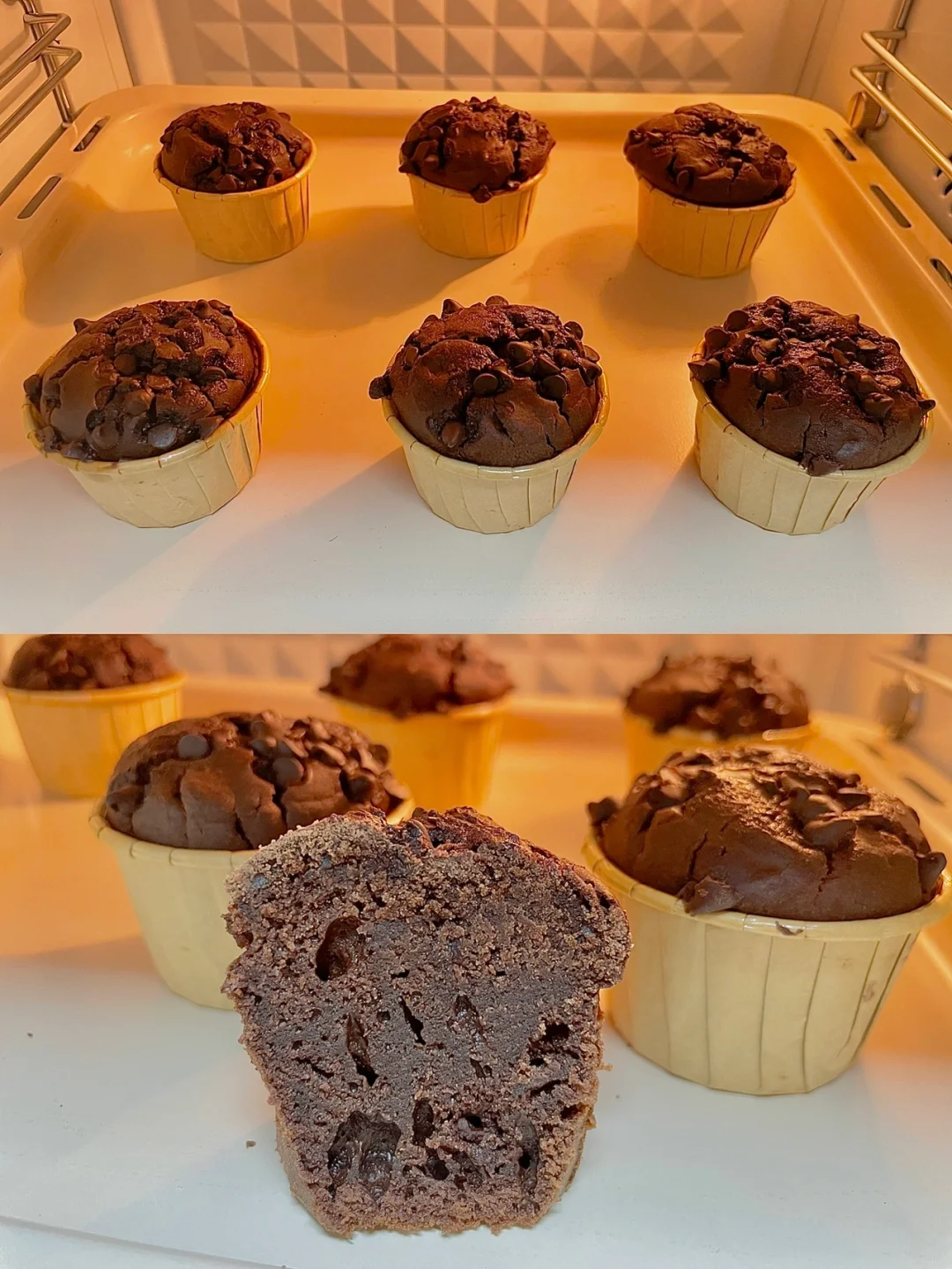 5⃣️面糊舀入纸杯模具中,顶部放适量巧克力豆,放入预热好的烤箱,170度烘烤25分钟左右