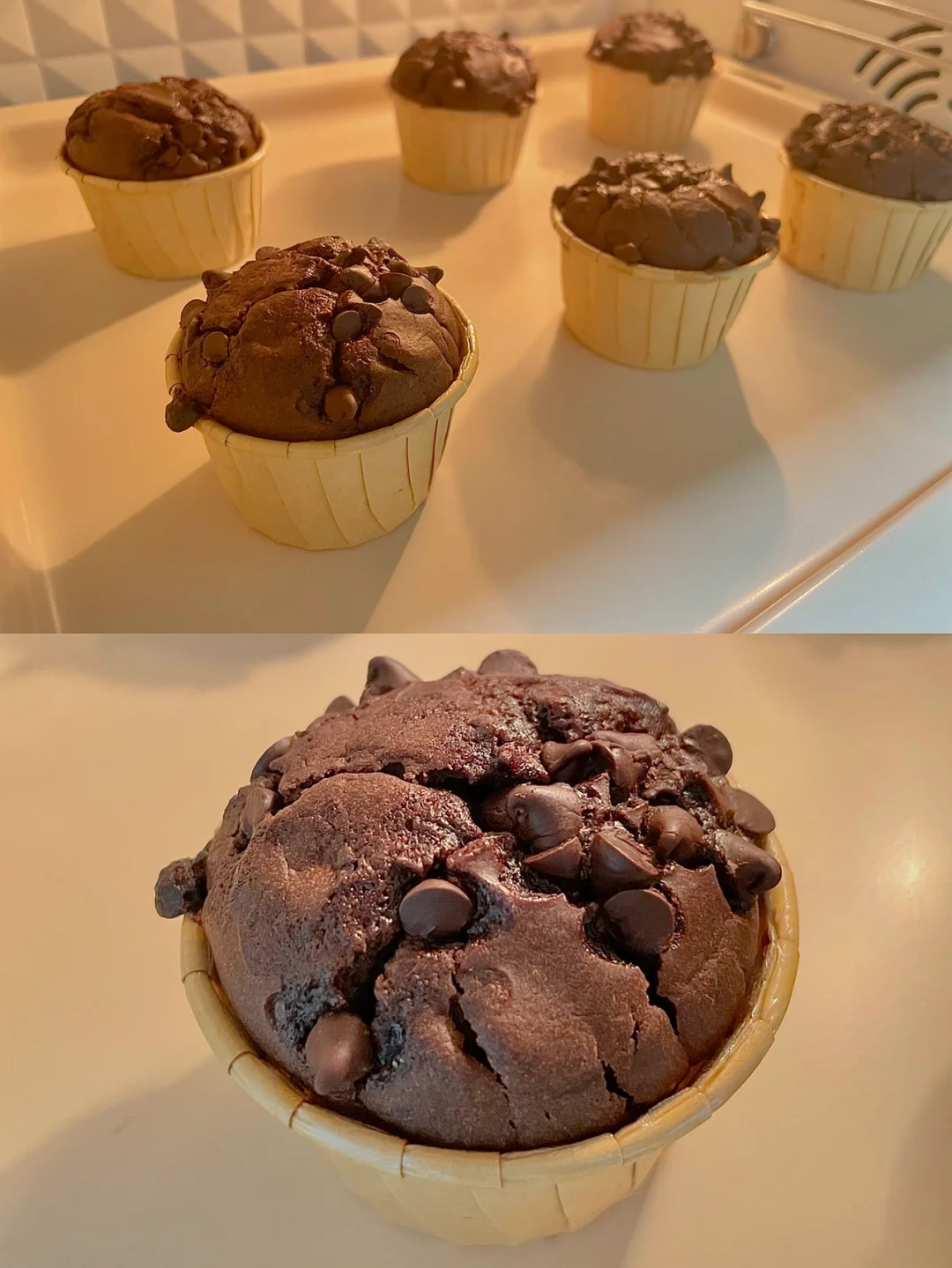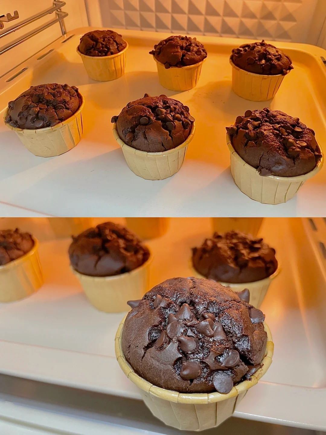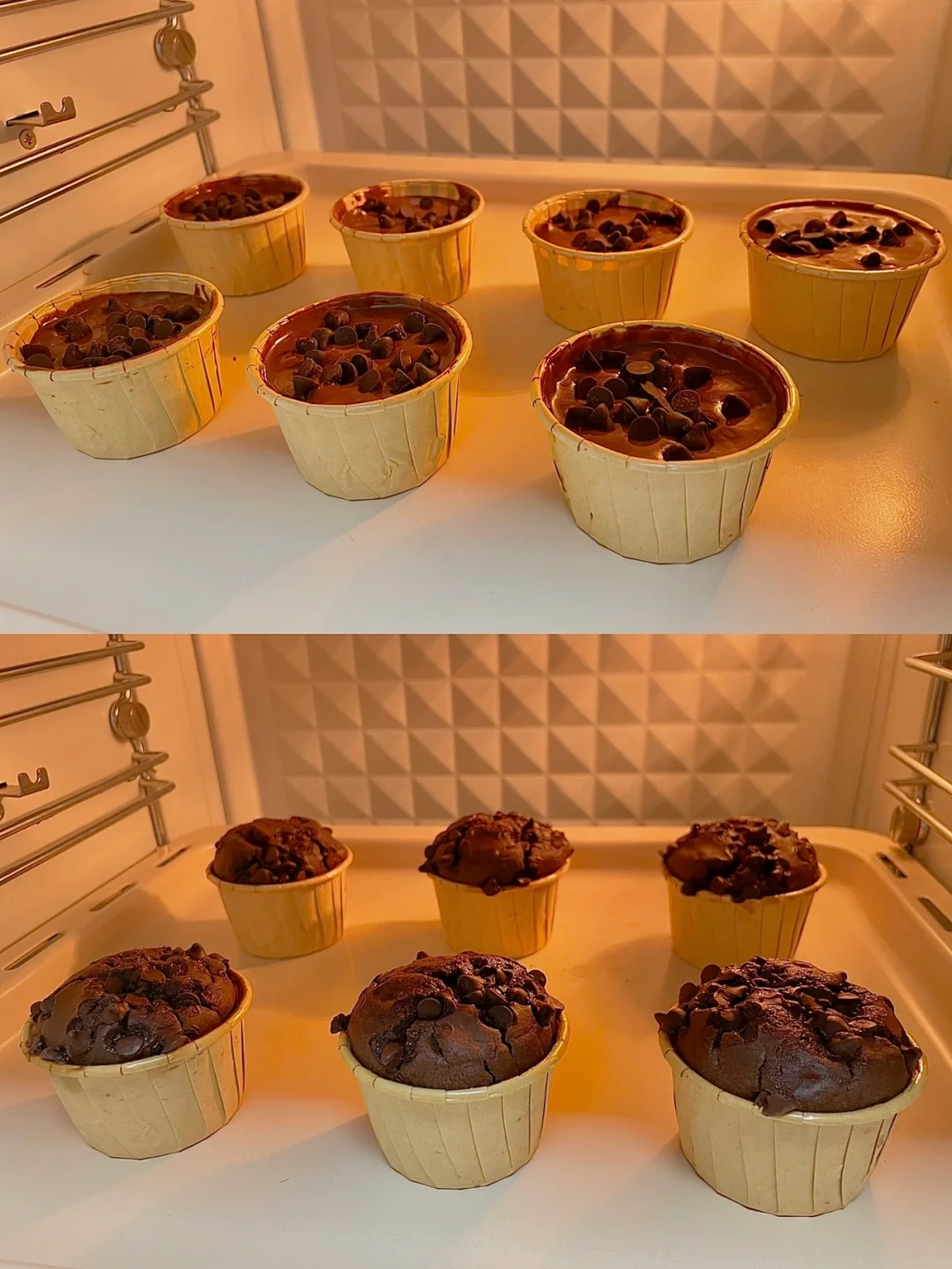 5⃣️面糊舀入纸杯模具中,顶部放适量巧克力豆,放入预热好的烤箱,170度烘烤25分钟左右