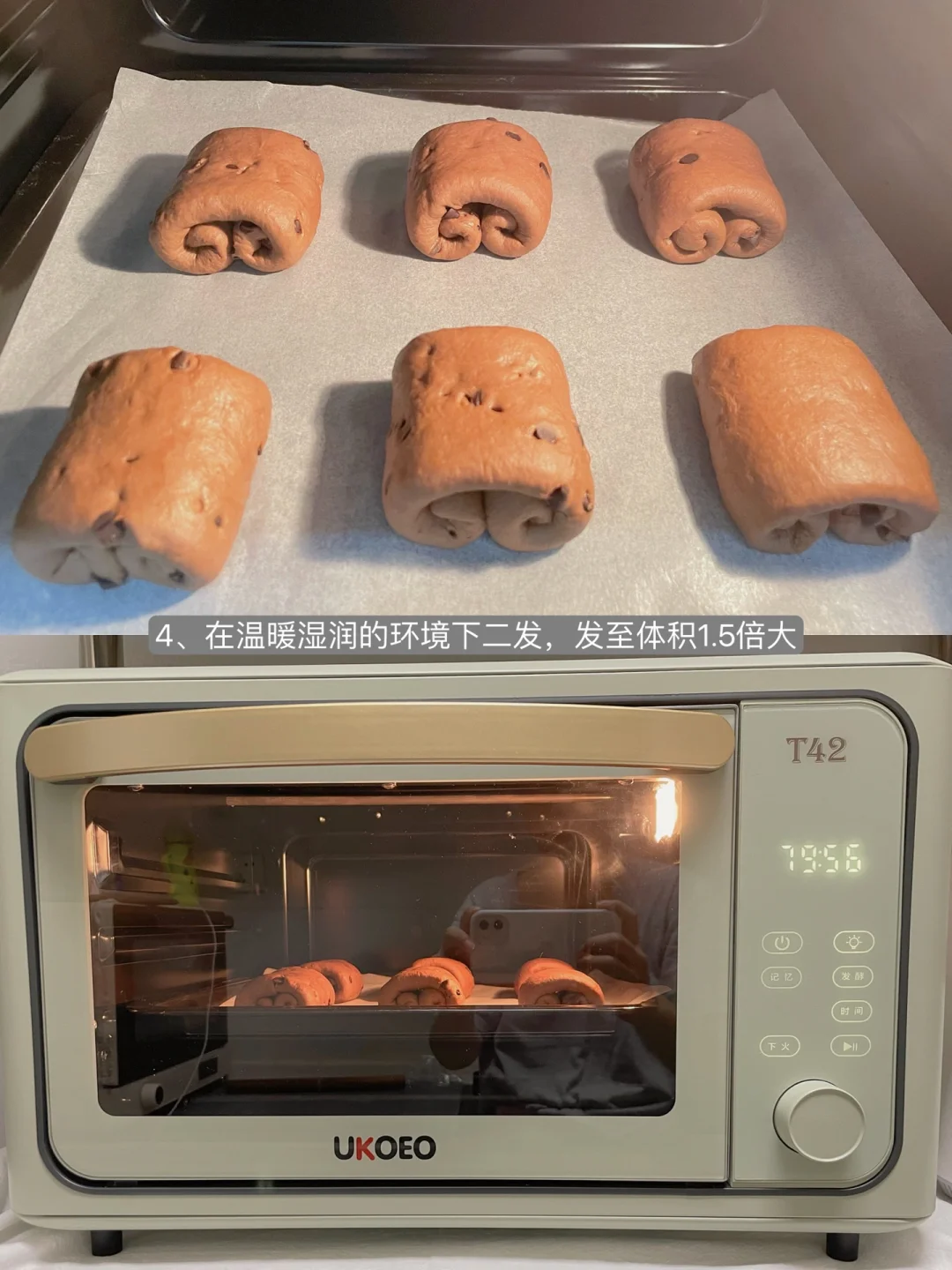 5⃣️在温暖湿润的环境下二发,可以放在烤箱里,开启发酵功能,烤箱里放一碗热水增加湿度