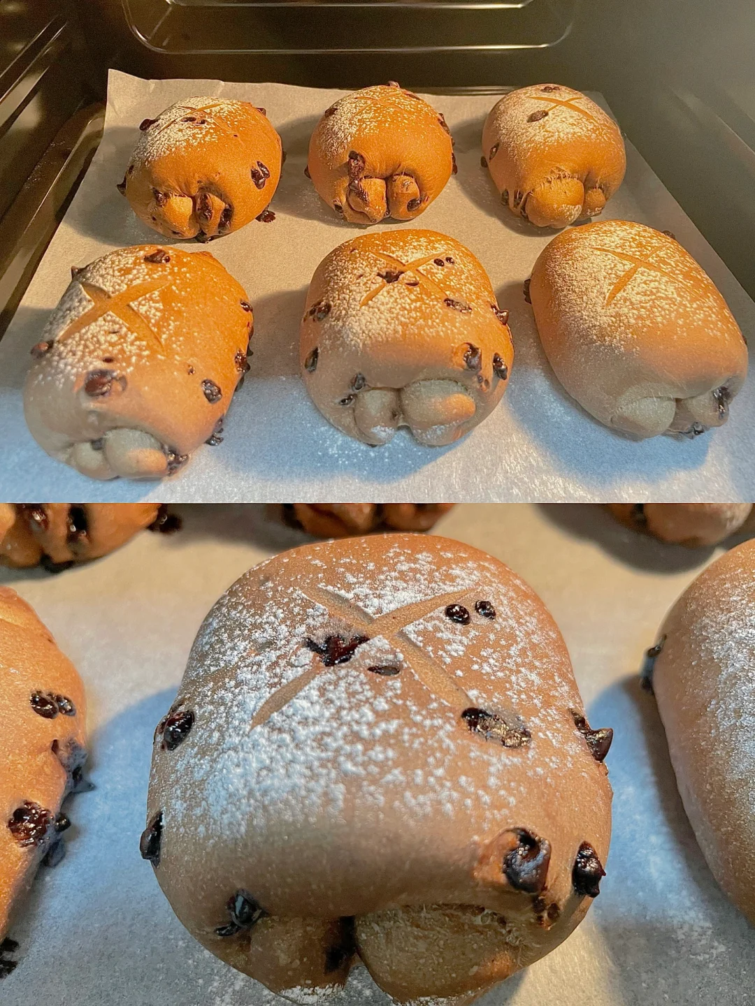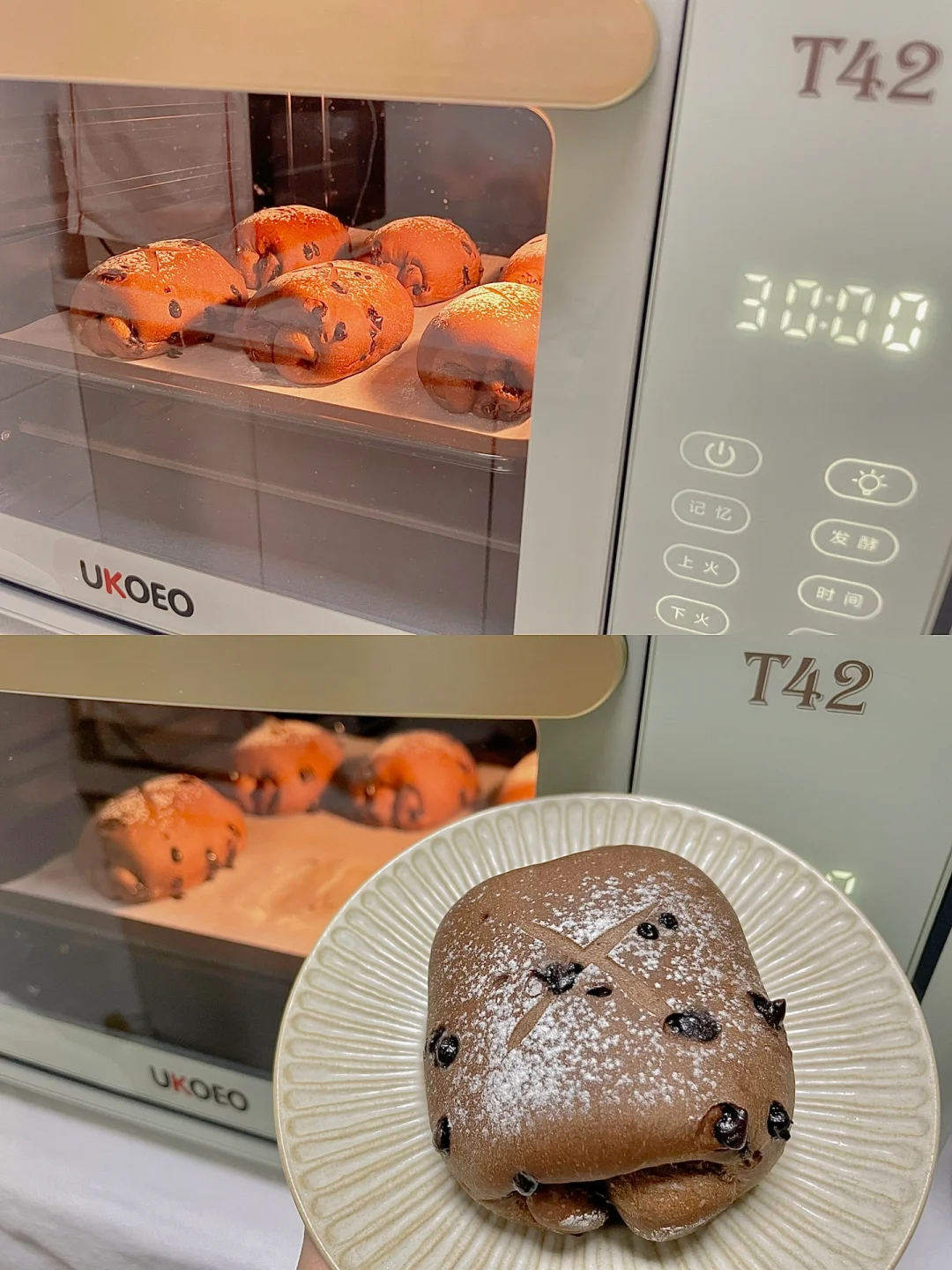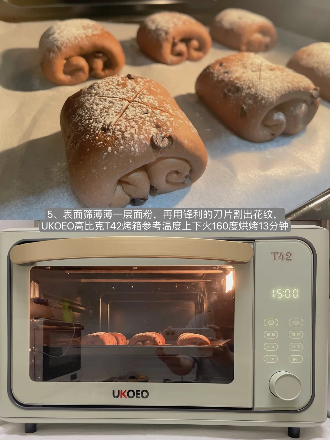 6⃣️二发至体积1.5倍大,表面筛薄薄一层面粉,再用锋利的刀片割出花纹,送入预热好的烤箱,UKOEO高比克T42烤箱参考温度上下火160度烘烤13分钟,烤好的面包上色均匀,满屋子里都是香浓的巧克力味道,太香啦❗️