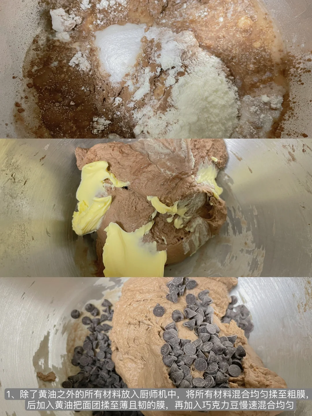 1⃣️除了黄油之外的所有材料放入厨师机中,将所有材料混合均匀揉至粗膜,后加入黄油把面团揉至薄且韧的膜,再加入巧克力豆慢速混合均匀