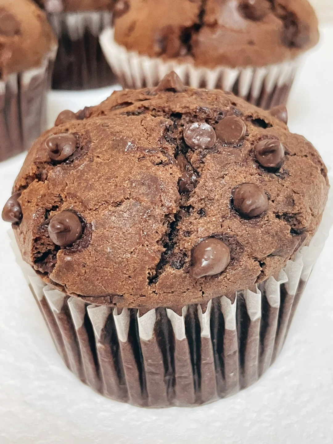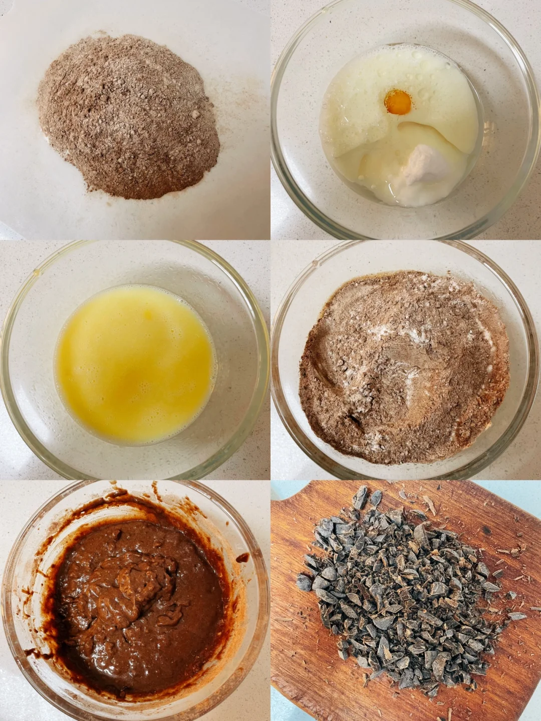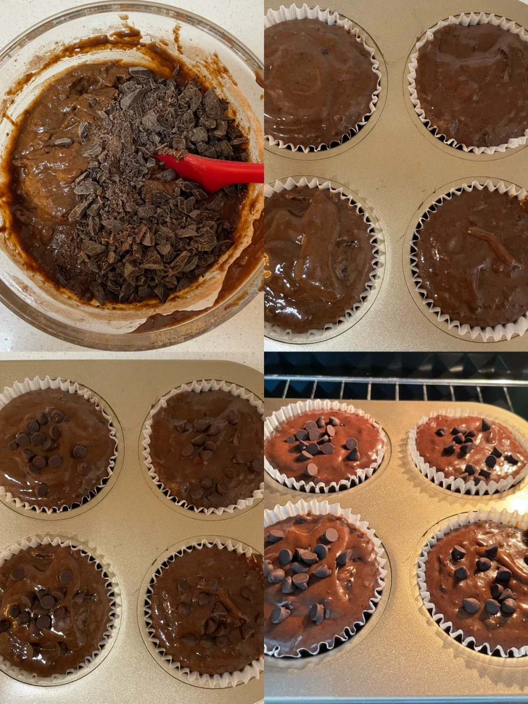 【所需食材(可做4个蛋糕)】 低筋面粉55克|玉米淀粉15克|泡打粉5克|可可粉30克|奶粉15克|全蛋液50克|玉米油45克|细砂糖45克|牛奶80克|巧克力40克|耐高温巧克力豆适量 【做法】 1⃣️低筋面粉、玉米淀粉、泡打粉、可可粉和奶粉过筛混合均匀 2⃣️玉米油、全蛋液、细砂糖和牛奶混合均匀 3⃣️把1⃣️和2⃣️混合均匀 4⃣️巧克力切碎与面糊混合均匀 5⃣️面糊倒入模具,表面撒耐高温巧克力豆 6⃣️放入预热好的烤箱160度烘烤30分钟左右