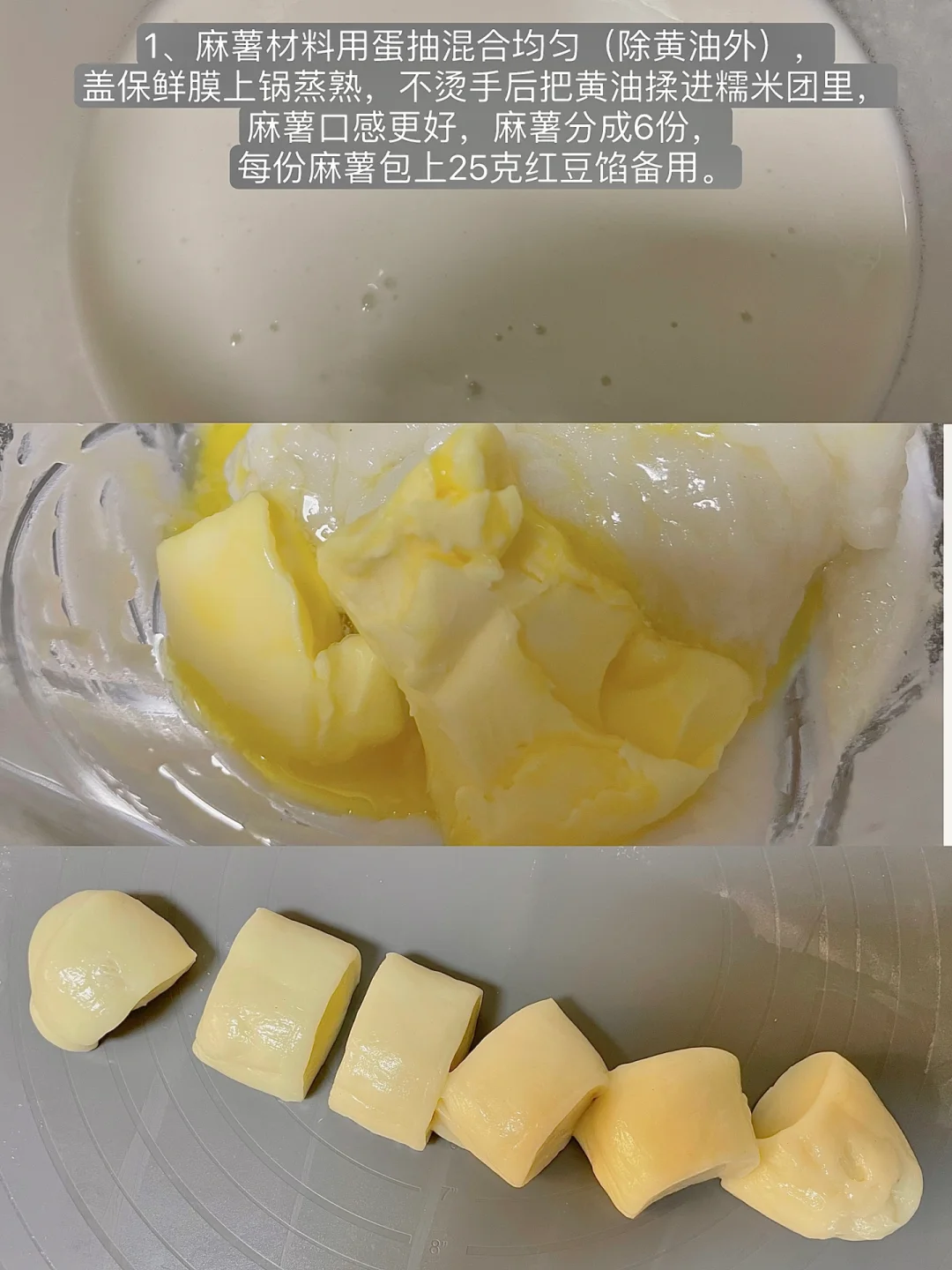 1⃣️ 麻薯材料用蛋抽混合均匀(除黄油外),盖保鲜膜上锅蒸熟(大约需要15分钟),没有液体就是熟了。趁热放入黄油,不烫手后把黄油揉进糯米团里,拉扯十几次,麻薯口感更好,(全程带一次性手套,不然很粘手)。麻薯分成6份,每份麻薯包上25克红豆馅备用。