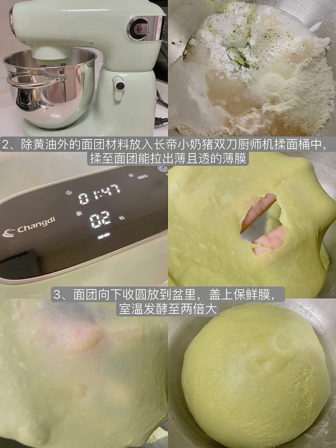 2⃣️除黄油外的面团材料放入长帝小奶猪双刀厨师机揉面桶中,小奶猪厨师机揉面过程噪音非常小,萌萌的造型,静静地看着它慢慢将面团揉好,过程非常治愈[萌萌哒R],先用2档将所有材料搅拌成团,再开5档揉至粗膜,加入软化的无盐黄油,开1档把黄油揉进面里,再开6档揉至面团能拉出薄且透的薄膜