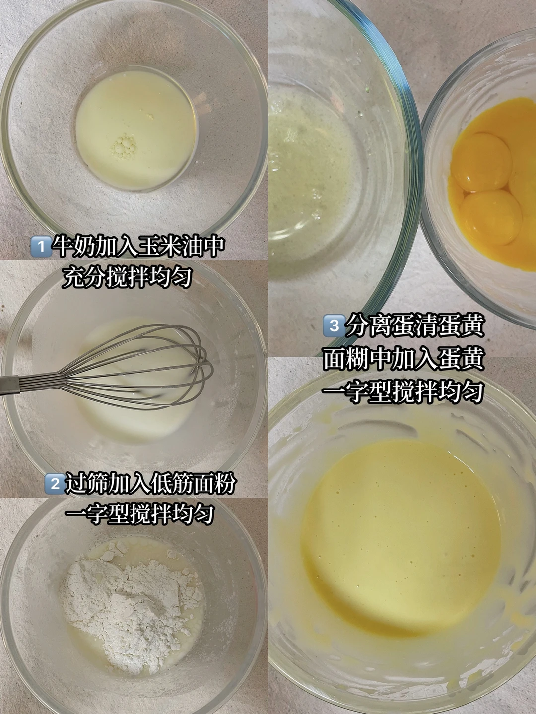 3⃣️分离蛋清蛋黄,面糊中加入蛋黄,一字型搅拌均匀