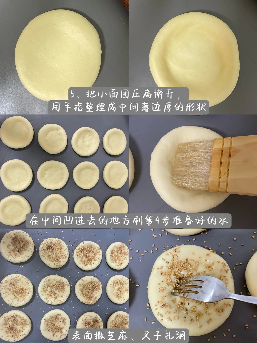 5⃣️把小面团压扁擀开,用手指整理成中间薄,边厚的形状,在中间凹进去的地方刷第4步准备好的水,表面撒芝麻、拿擀面杖的头压一下防止芝麻掉落,叉子扎洞
