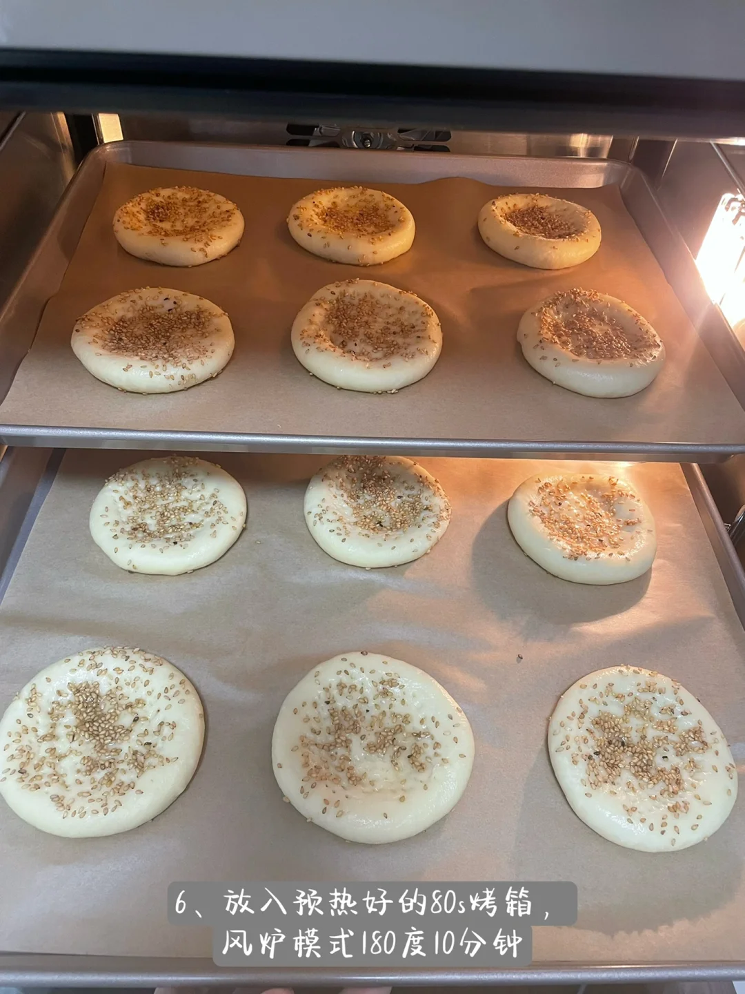 6⃣️放入预热好的80s烤箱,风炉模式180度10分钟(平炉参考温度200度10分钟,平炉只能烤一盘建议材料减半)